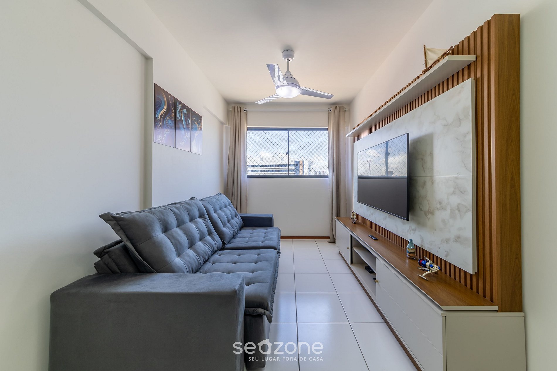 - Sala de estar com sofá-, smart TV, mesa com 4 cadeiras e ventilador de teto;