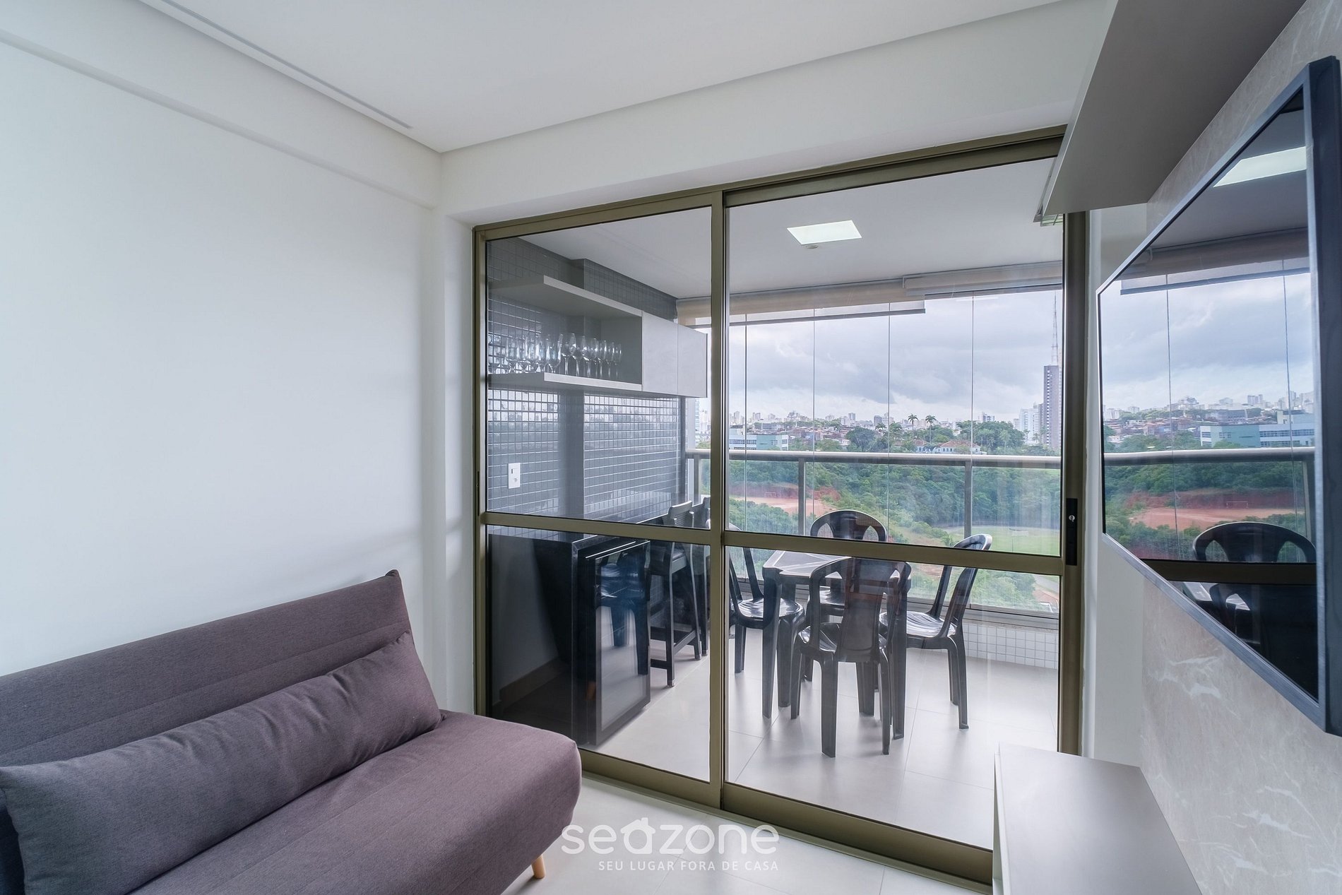 - Sala de estar com sofá-cama, Smart TV e ar-condicionado;