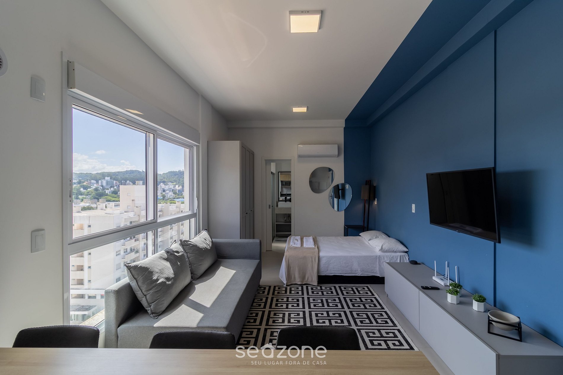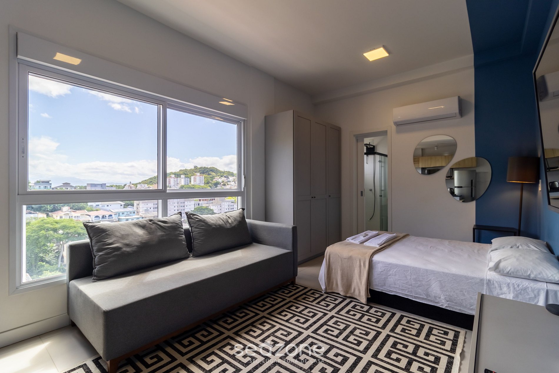- Estúdio com 1 cama de casal, sofá, smart TV de tela plana, cortinas blackout, armário e ar-condicionado;