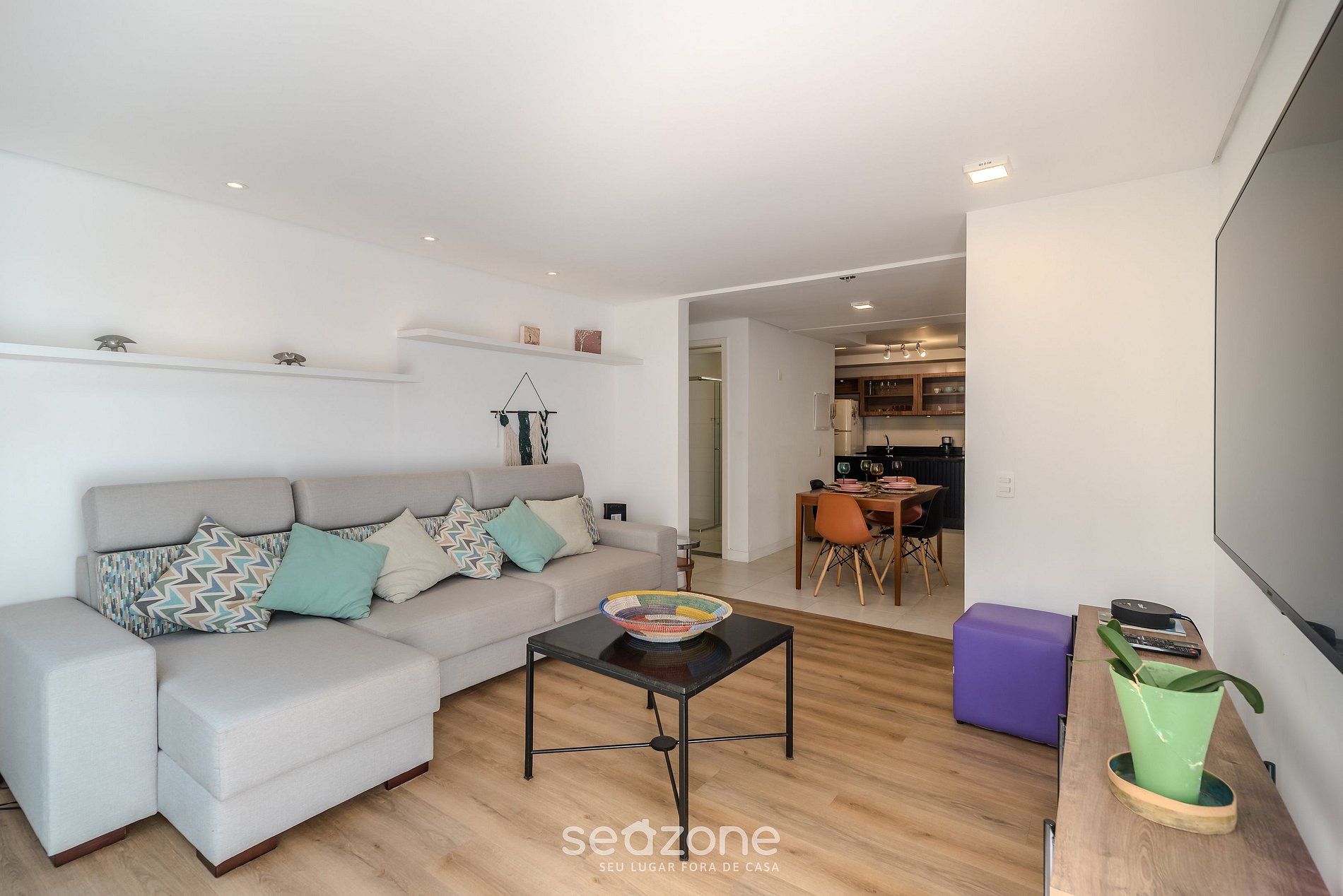 - Sala de estar com sofá, smart TV e mesa com 4 cadeiras;