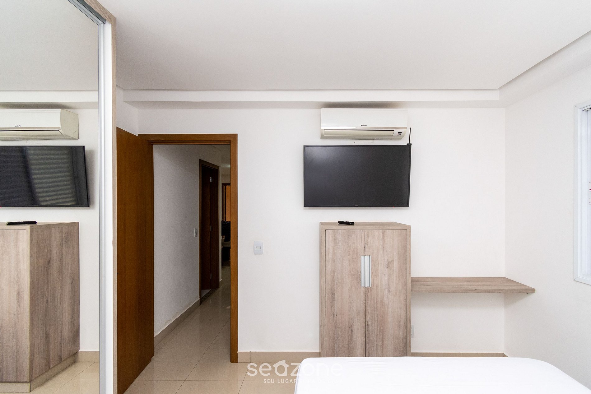 Tenha uma estadia completa neste flat moderno em Goiânia, Setor Bueno. Cozinha equipada, Smart TV, Wi-Fi de alta velocidade e check-in sem chave e ar condicionado para você ter o máximo de conforto.