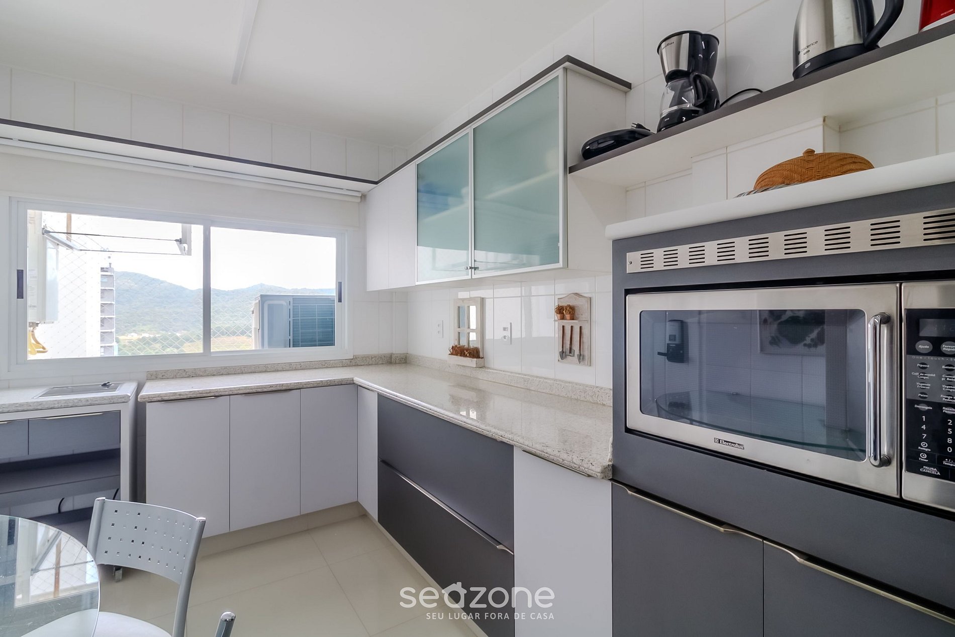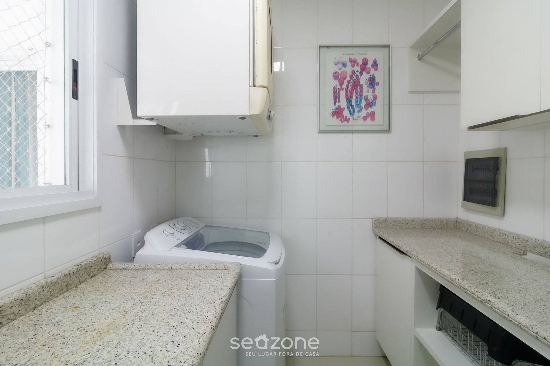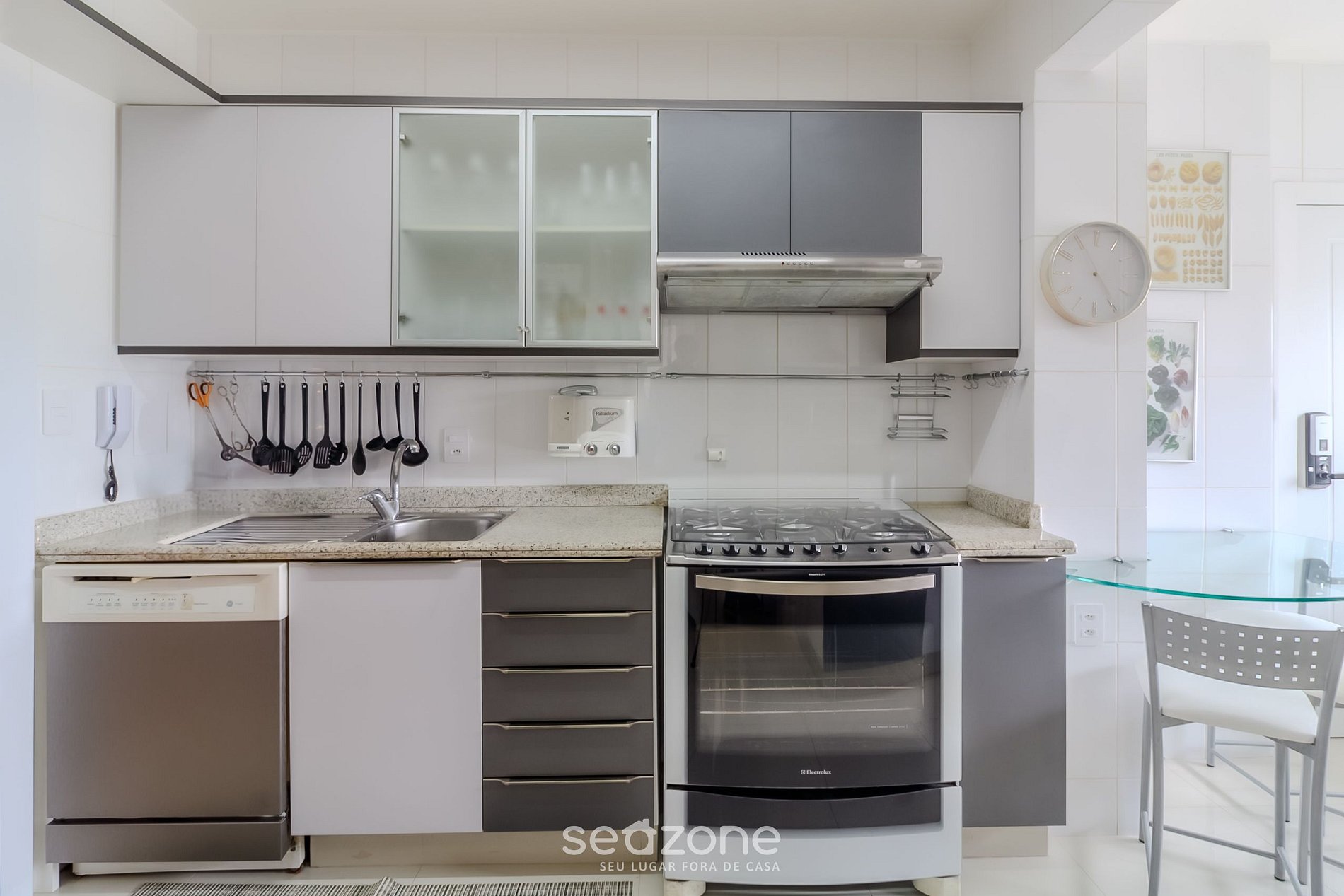 - Cozinha completa com lava louça, geladeira, fogão e forno a gás, micro-ondas, sanduicheira, cafeteira elétrica, chaleira elétrica, liquidificador, taças de vinho, panelas, louças e utensílios;
