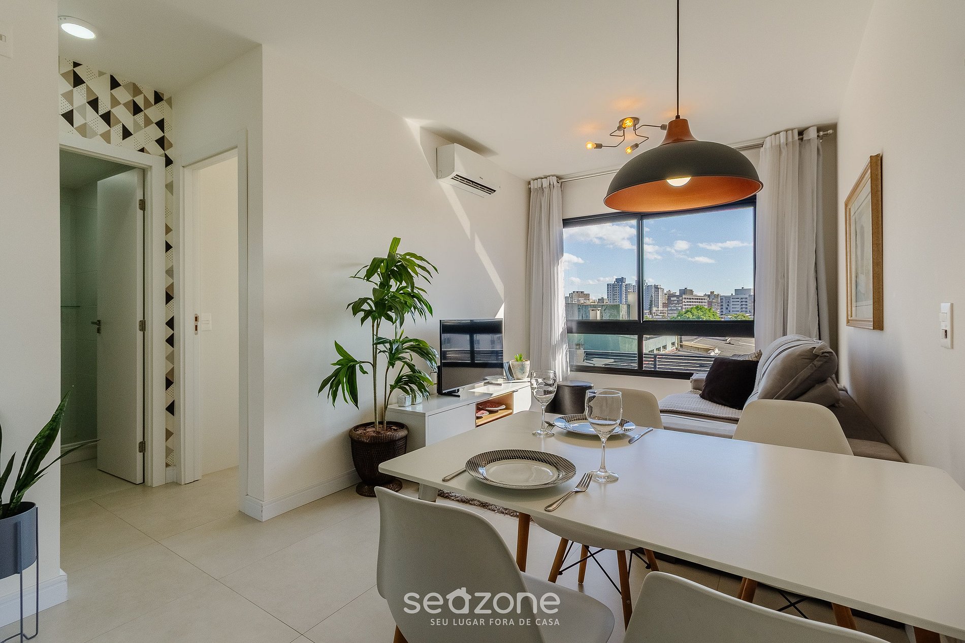 - Sala de estar com sofá, 2 puffs, Smart TV e ar-condicionado;
