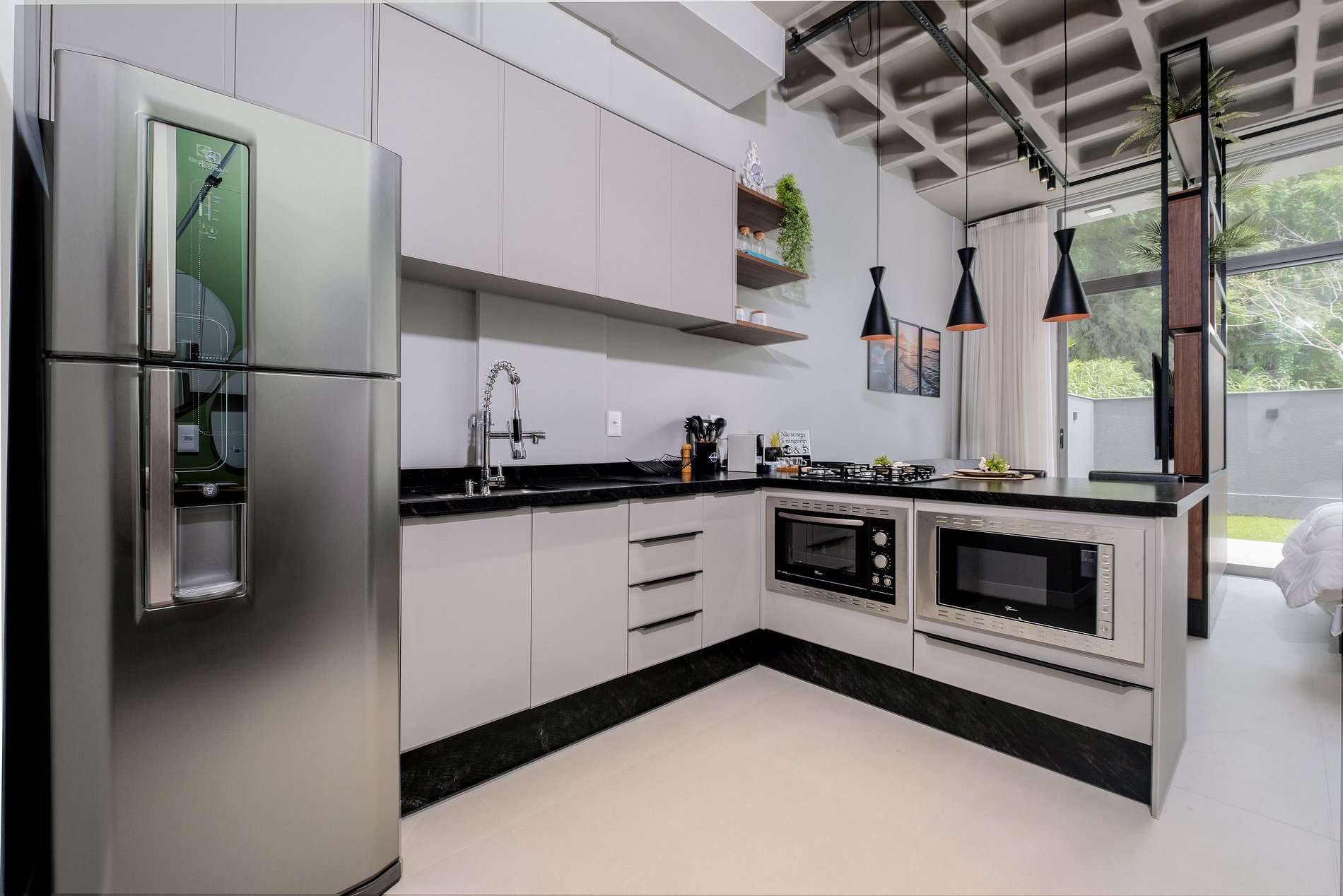 - Cozinha compacta com geladeira, fogão cooktop, forno, micro-ondas, sanduicheira, cafeteira, liquidificador, panelas, louças e utensílios;