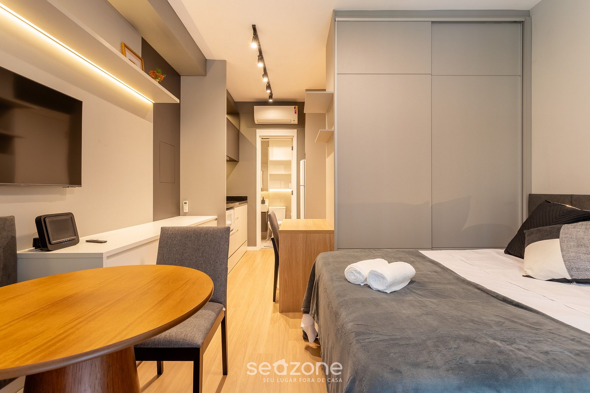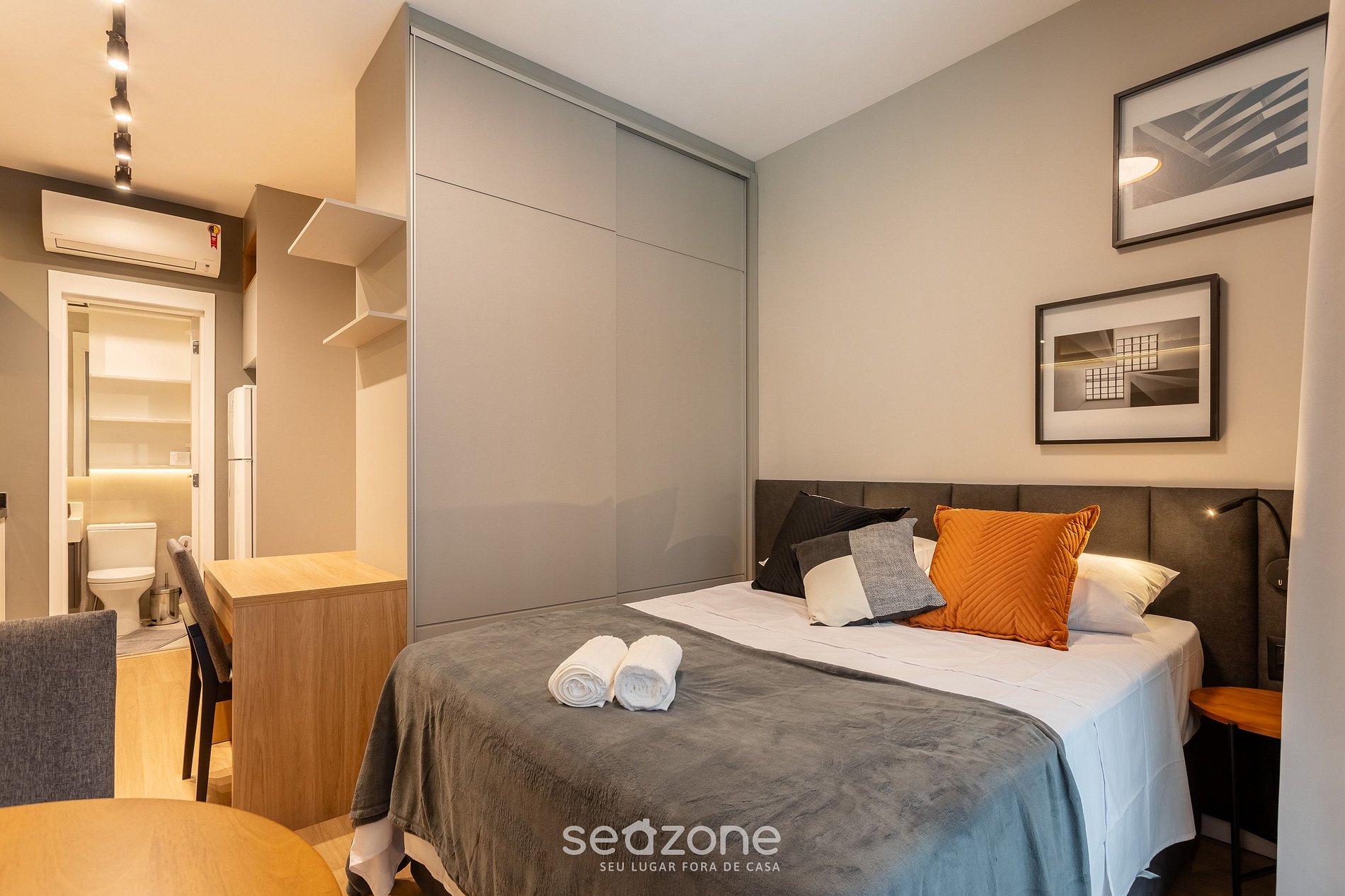 - Cama de casal, armário, smart TV, espaço para trabalho e ar-condicionado;