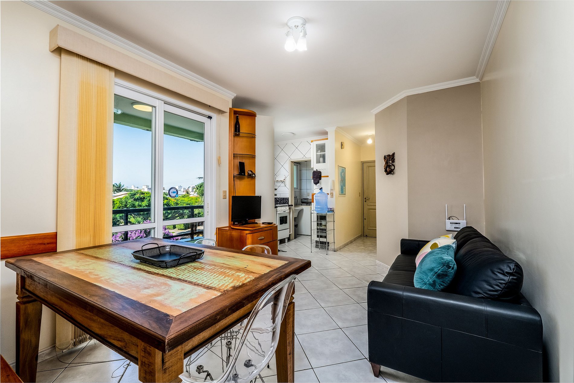 - Sala de estar com sofá, TV e mesa para jantar com banco e 3 cadeiras ;