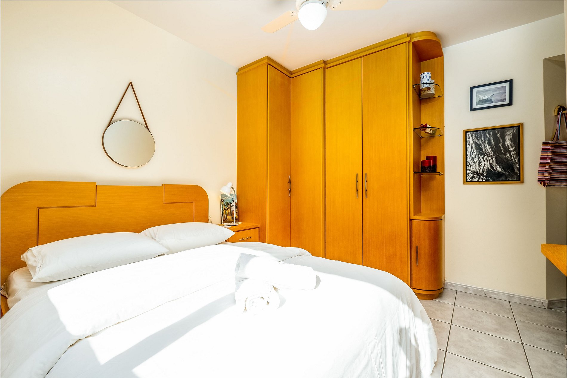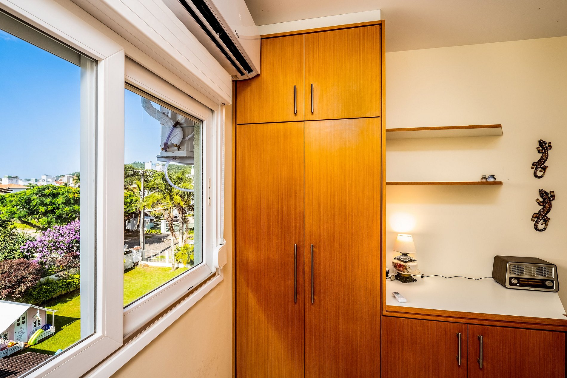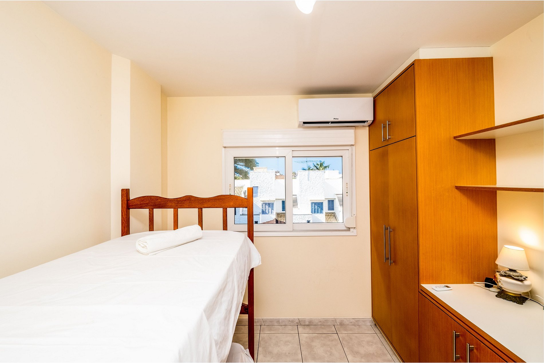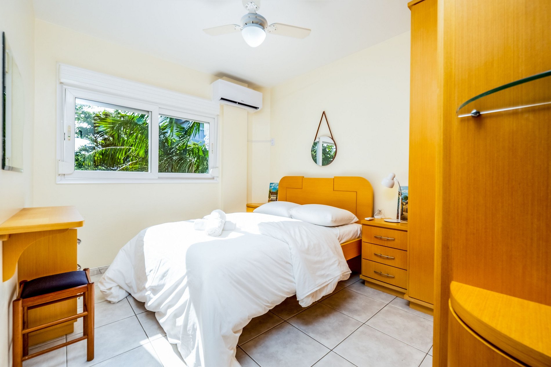 - 1 quarto com cama de casal, armário, ventilador de teto e ar-condicionado;