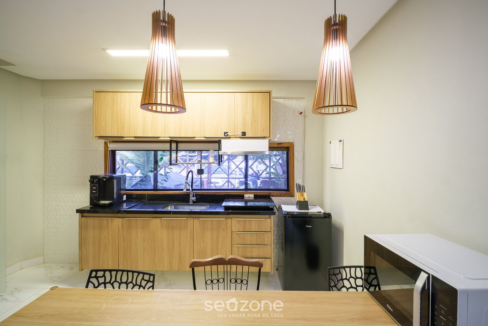 - Cozinha completa com frigobar, cooktop, micro-ondas, sanduicheira, cafeteira elétrica, chaleira, liquidificador, filtro de águas, taças de vinho, panelas, louças e utensílios;
