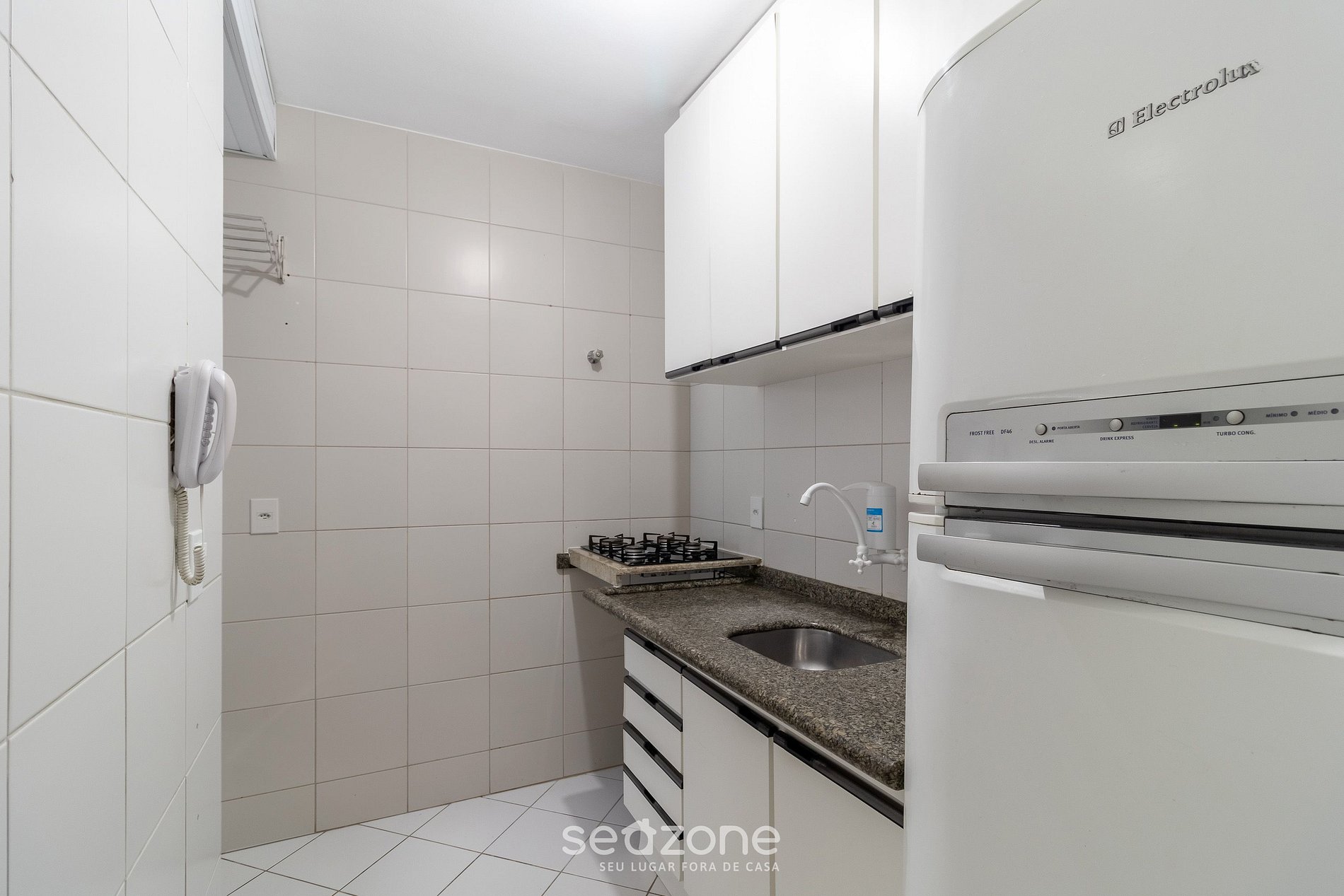 - Cozinha completa com geladeira, fogão cooktop, micro-ondas, sanduicheira, kit café (funil, garrafa térmica), chaleira, liquidificador, taças de vinho, panelas, louças e utensílios;