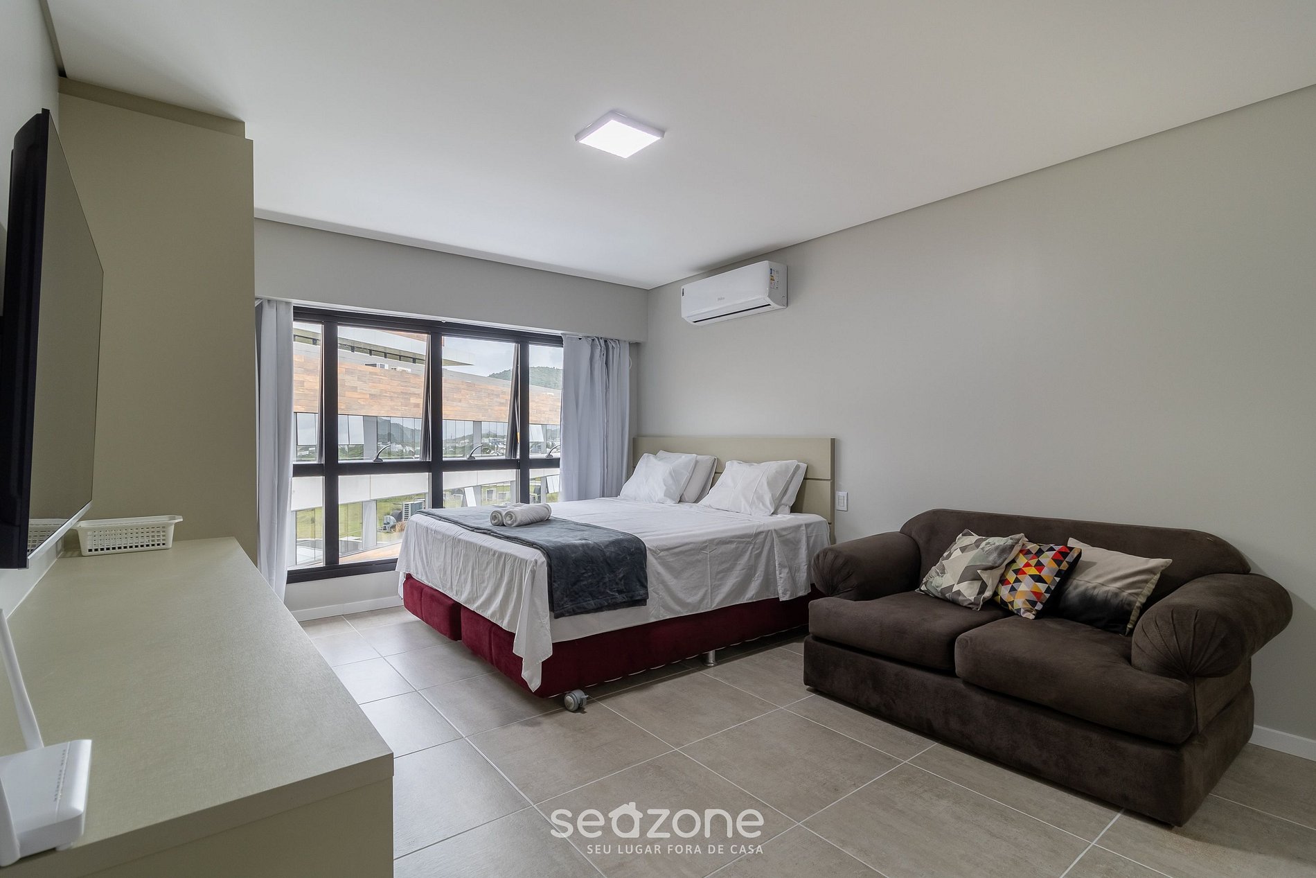 - Cama king size, arara para roupas, sofá cama casal, Smart TV e cozinha integrada;