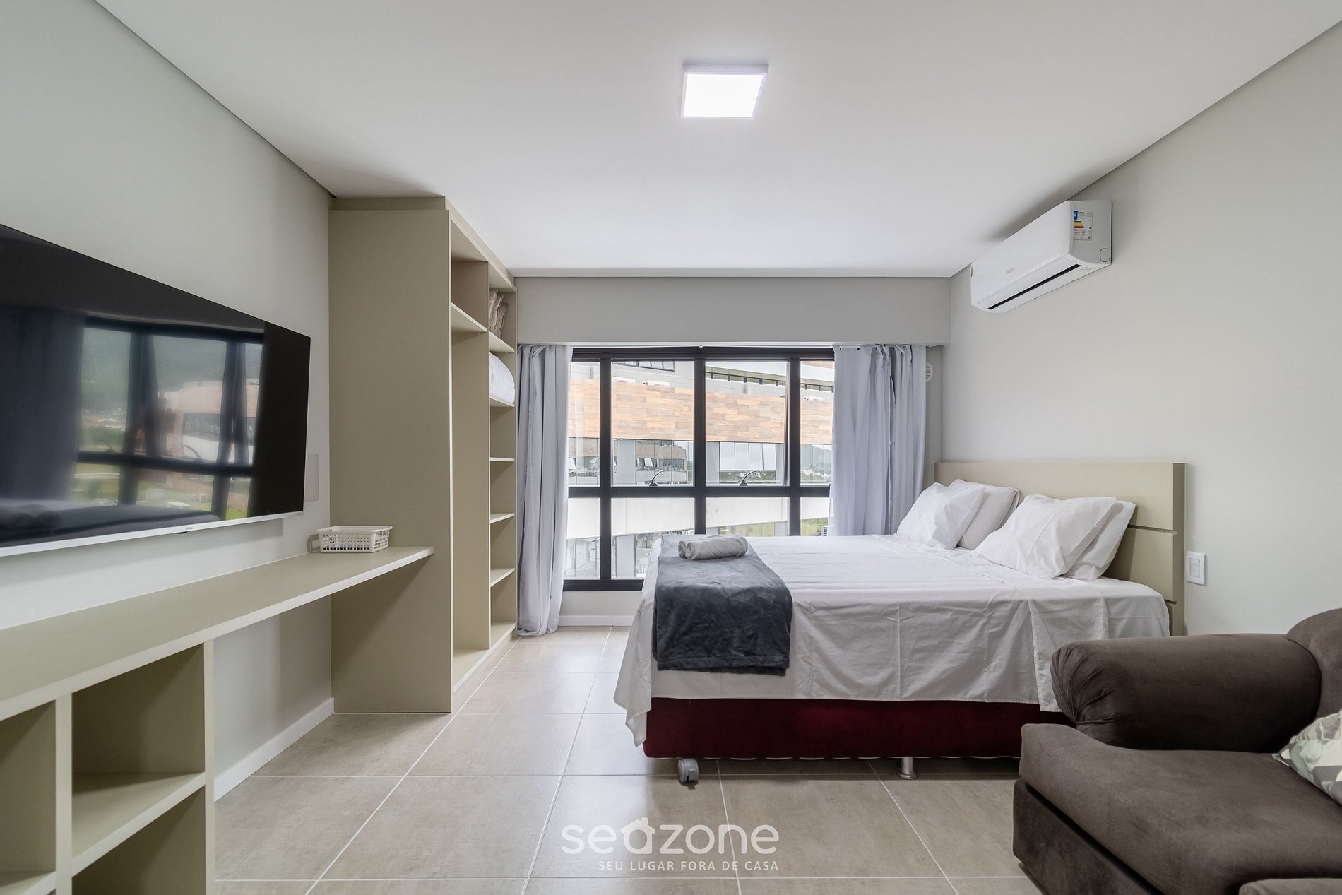 - Cama king size, arara para roupas, sofá cama casal, Smart TV e cozinha integrada;