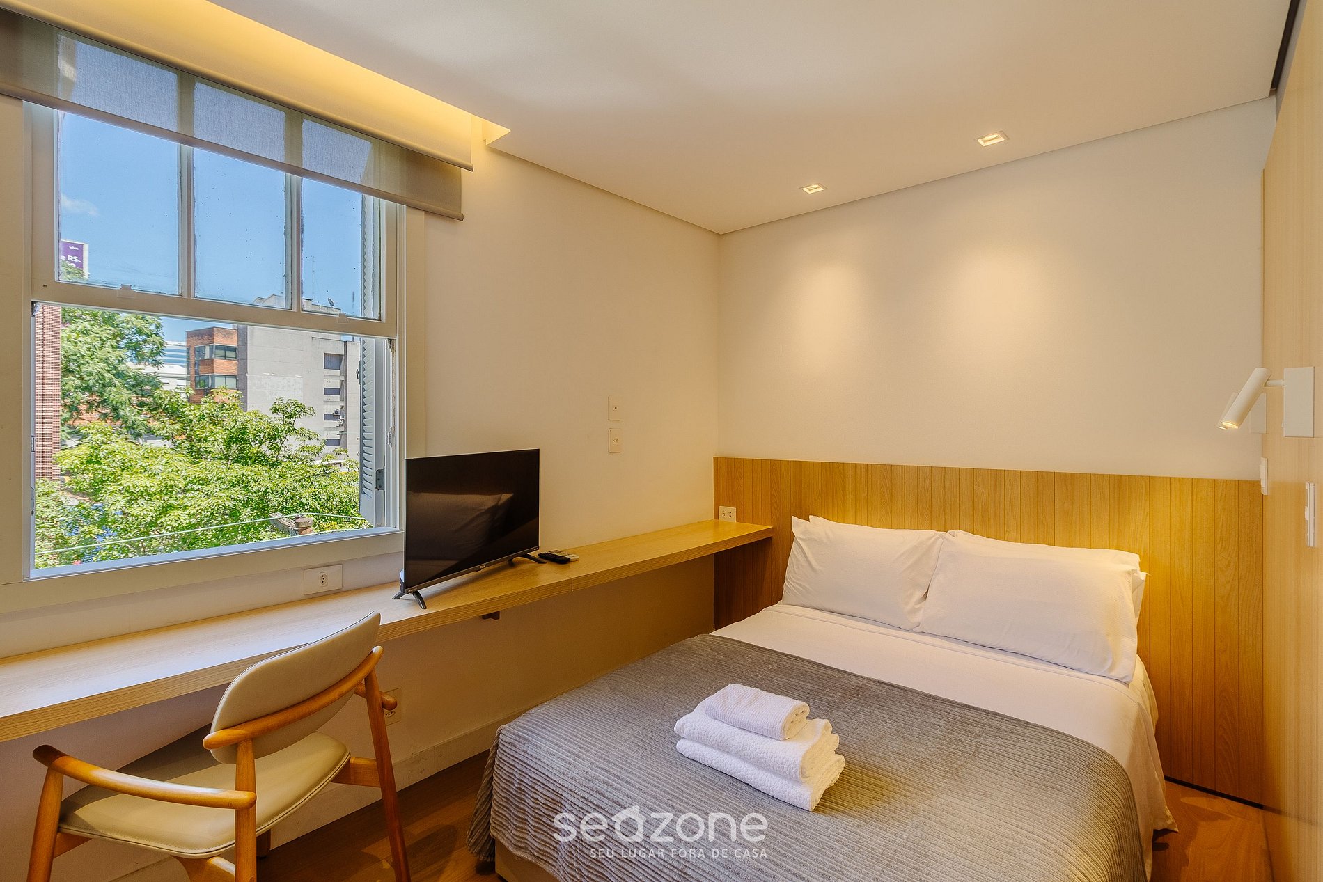 - Cama de casal, sofá, armário, smart TV, espaço para trabalho e ar-condicionado;