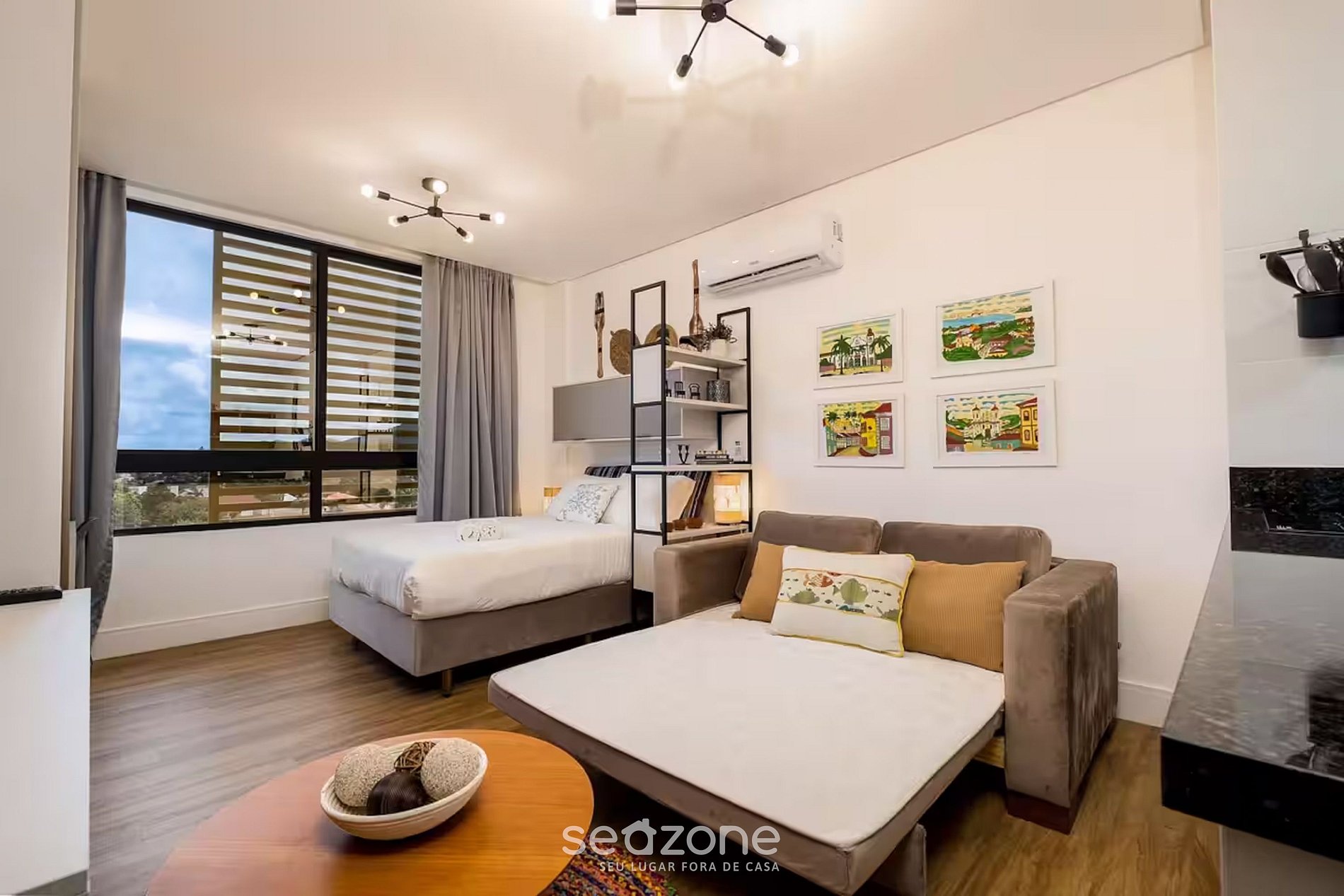 - Sala de estar climatizada com móveis planejados, sofá-cama e televisão (smart);