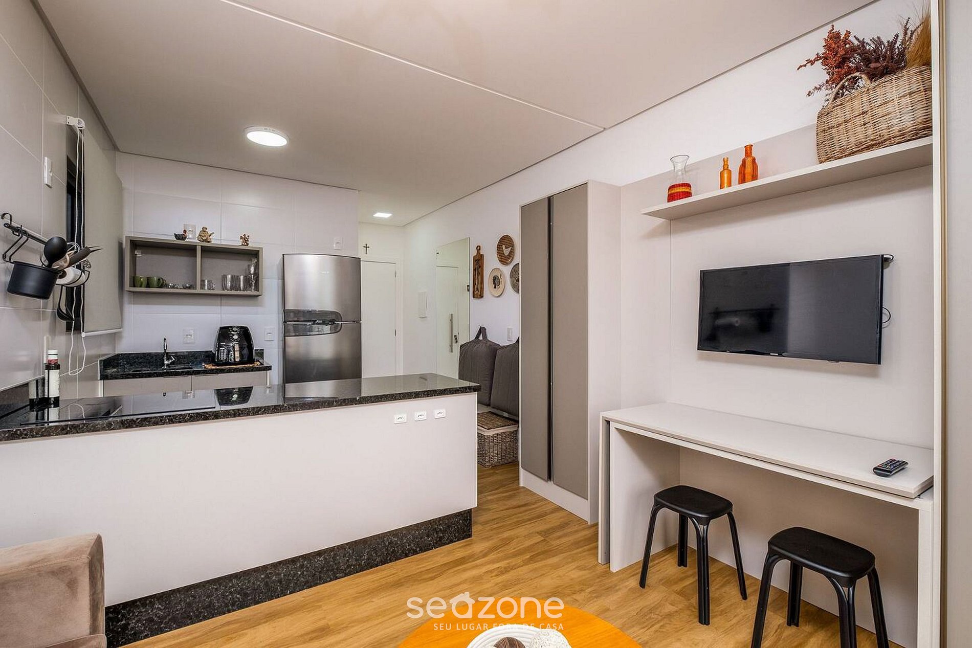 - Cozinha compacta com geladeira, fogão, micro-ondas, cafeteira, Air-fryer, chaleira elétrica, panelas e outros utensílios;