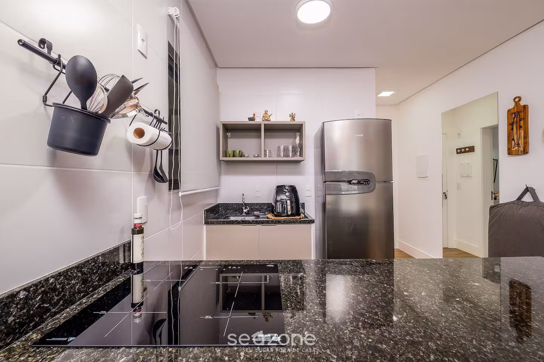 - Cozinha compacta com geladeira, fogão, micro-ondas, cafeteira, Air-fryer, chaleira elétrica, panelas e outros utensílios;