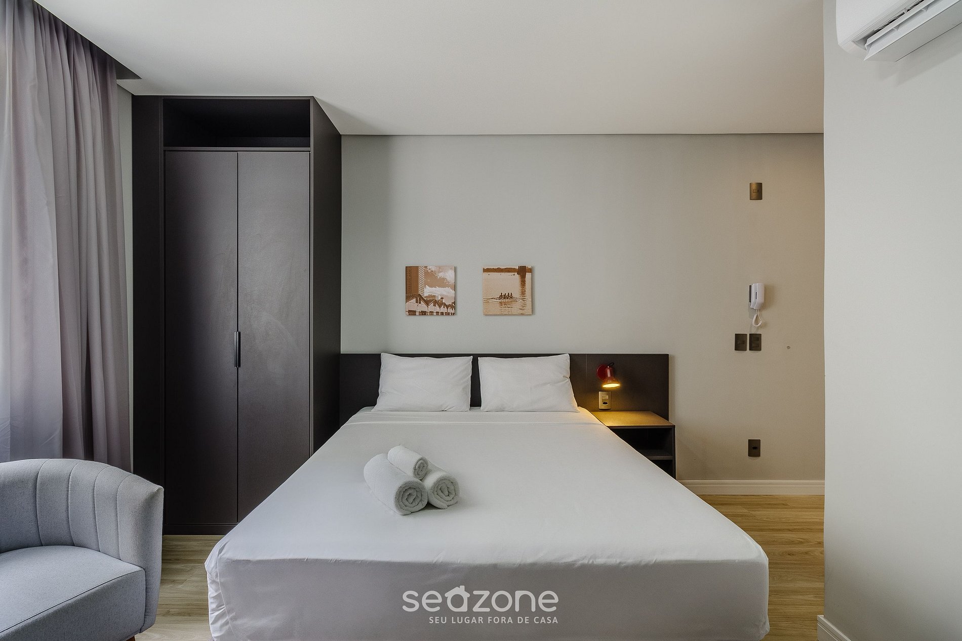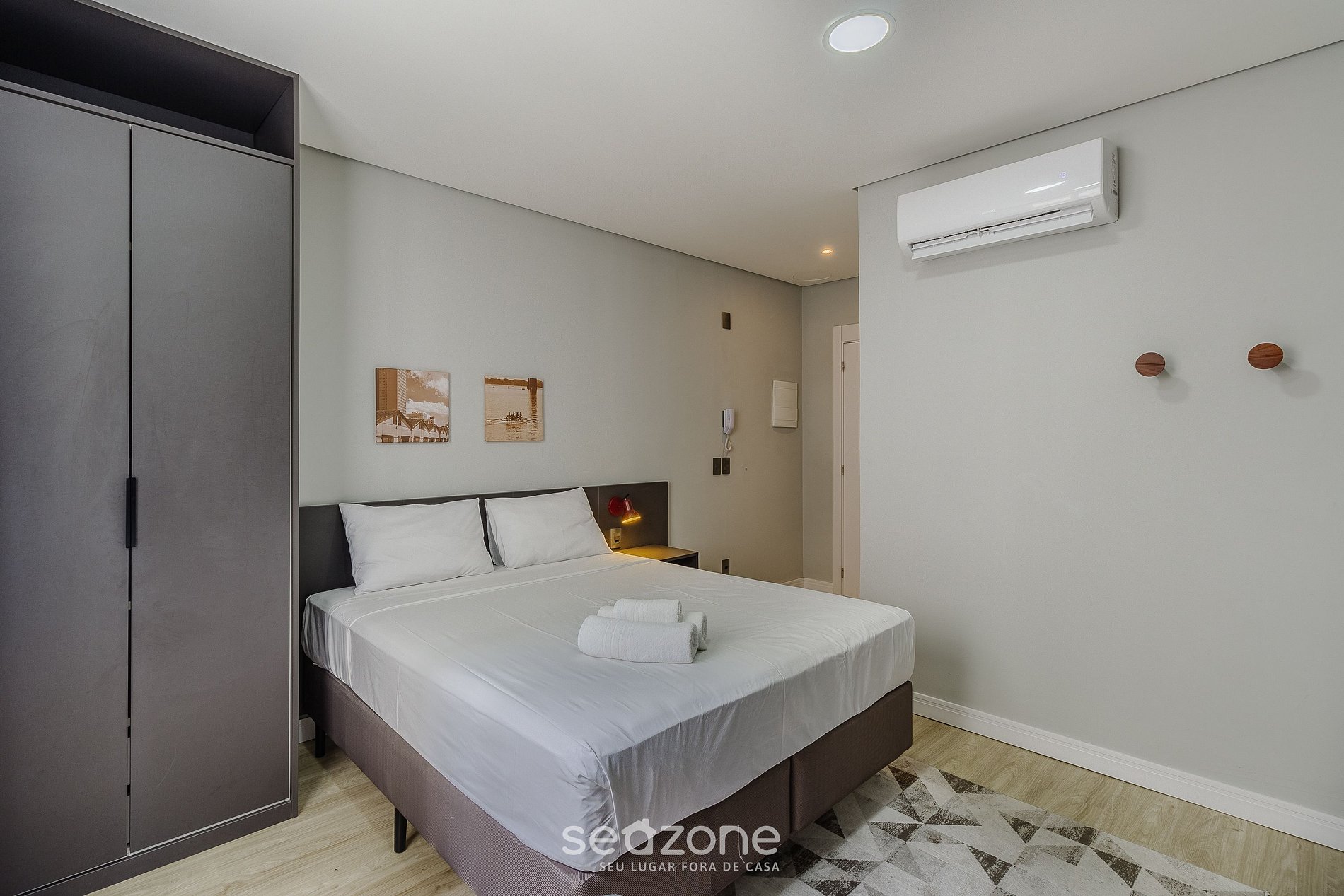 - Studio com cama de casal queen size, armário e ar-condicionado;