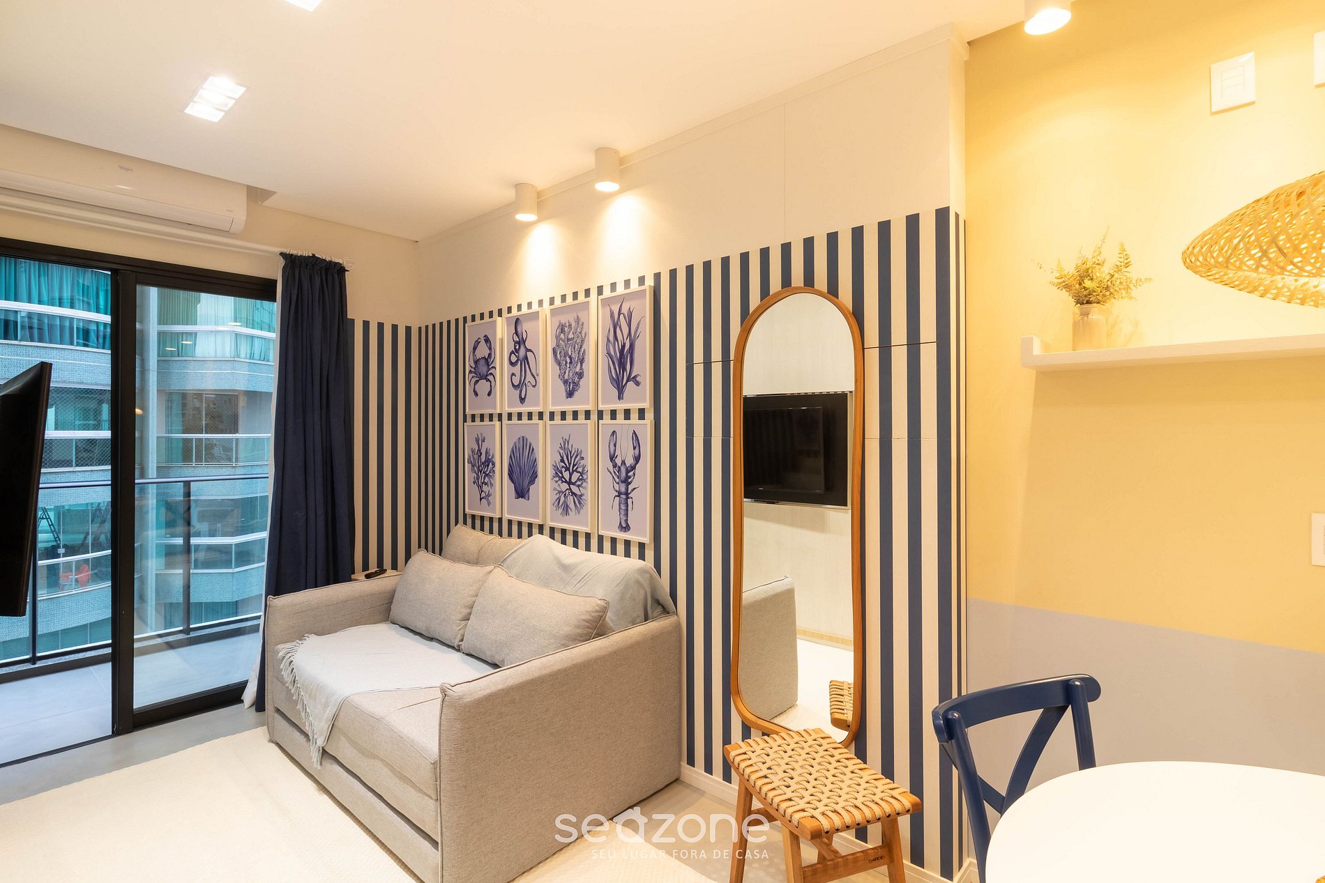 - Espaço com sofá, Smart TV e ar-condicionado;