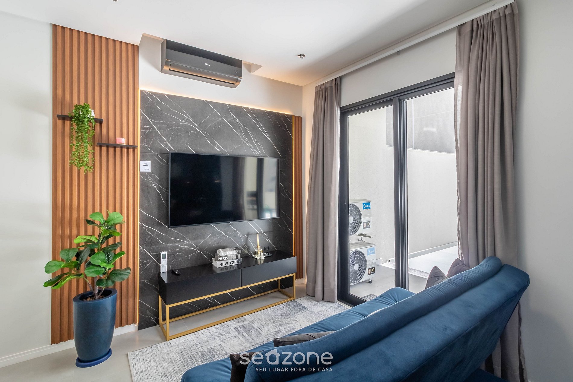 - Sala com sofá, cortinas blackout, Smart TV e ar-condicionado;