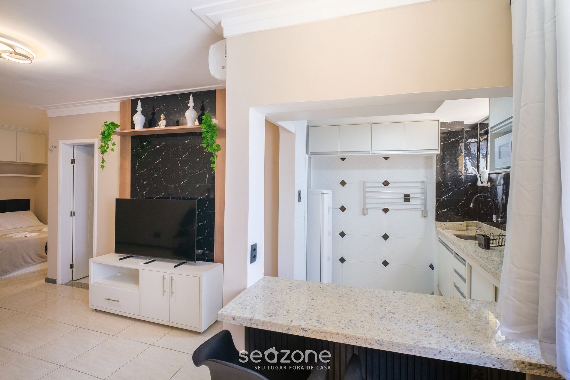 - Sala de estar com sofá, smart TV e ar-condicionado;