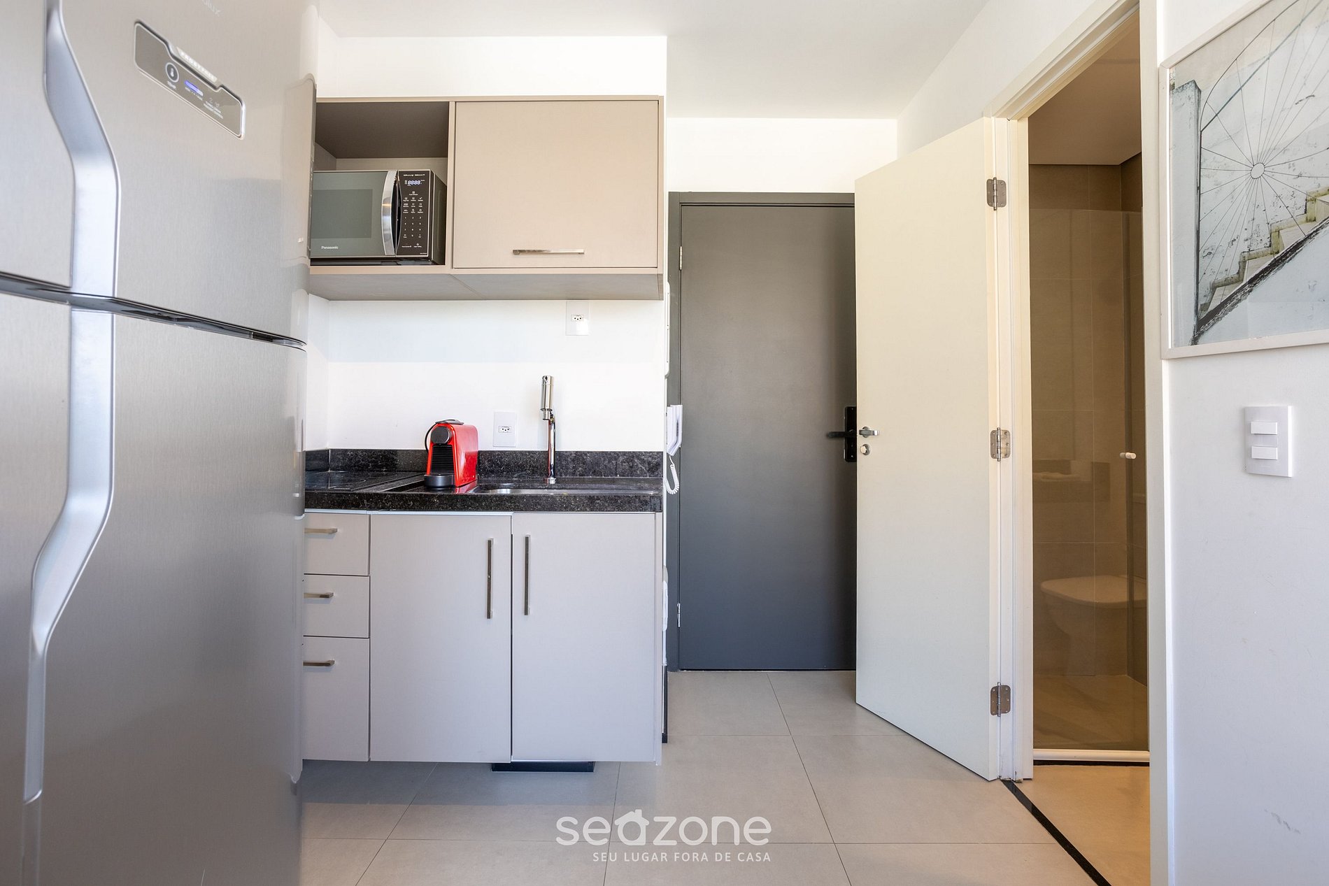 - Cozinha completa com geladeira, fogão cooktop, micro-ondas, cafeteira elétrica, taças de vinho, panelas, louças e utensílios;