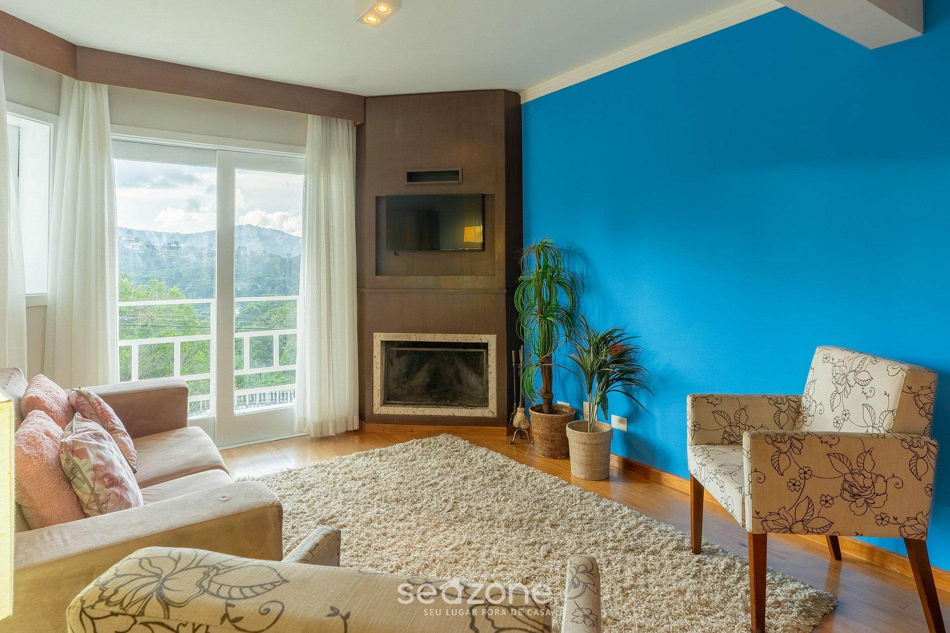 O apto é duplex com ambientes arejados, uma lareira na sala de estar, acomoda até 6 pessoas, tem uma cozinha completa e sala de jantar perfeita para se reunir e confraternizar durante as refeições.