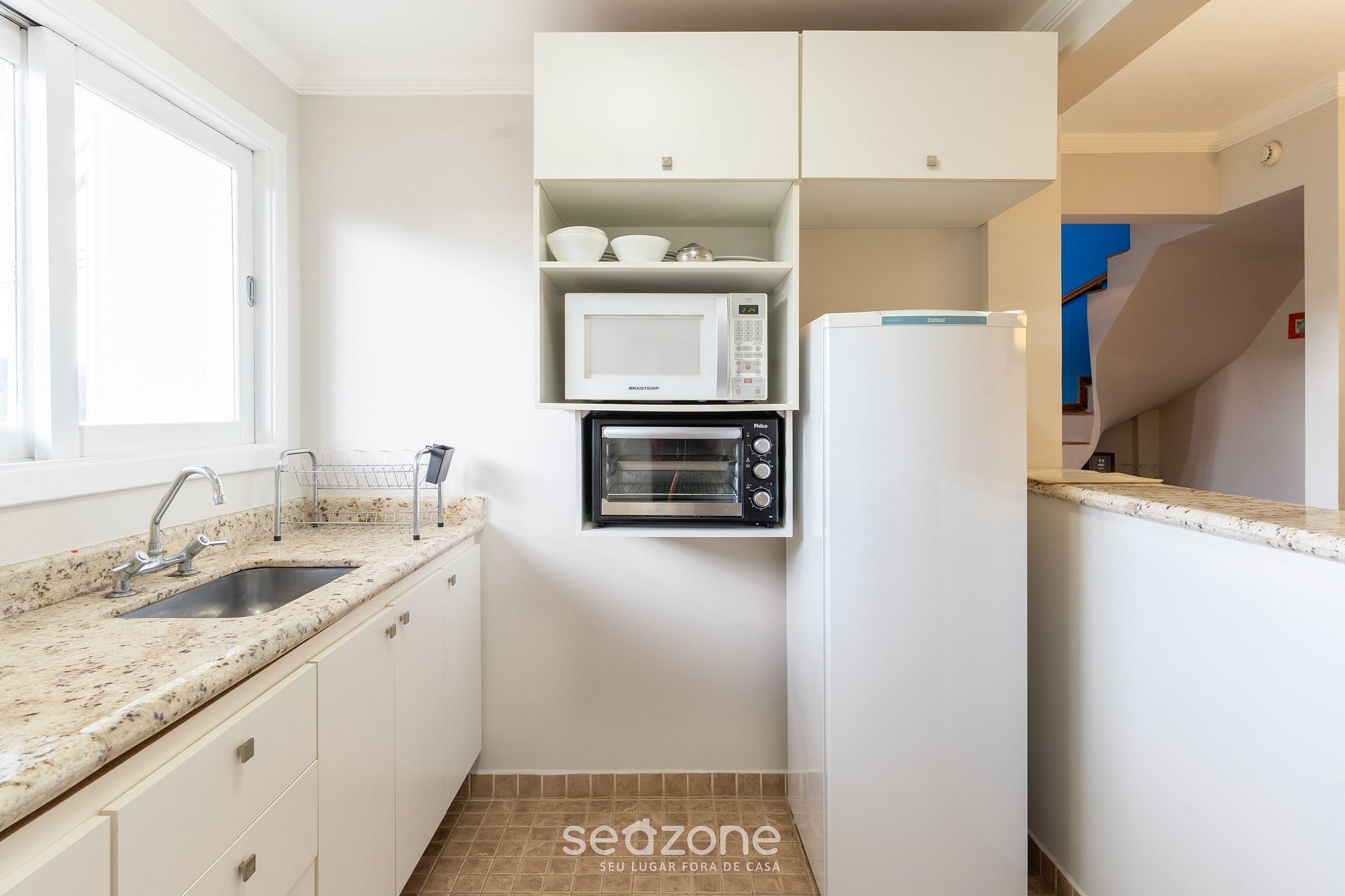 - Cozinha completa com geladeira, fogão cooktop, forno elétrico, micro-ondas, sanduicheira, cafeteira, liquidificador e utensílios;