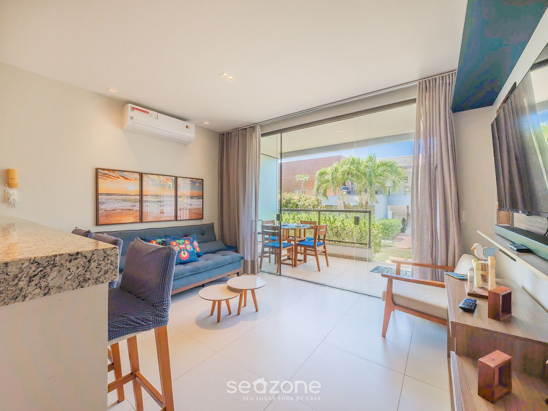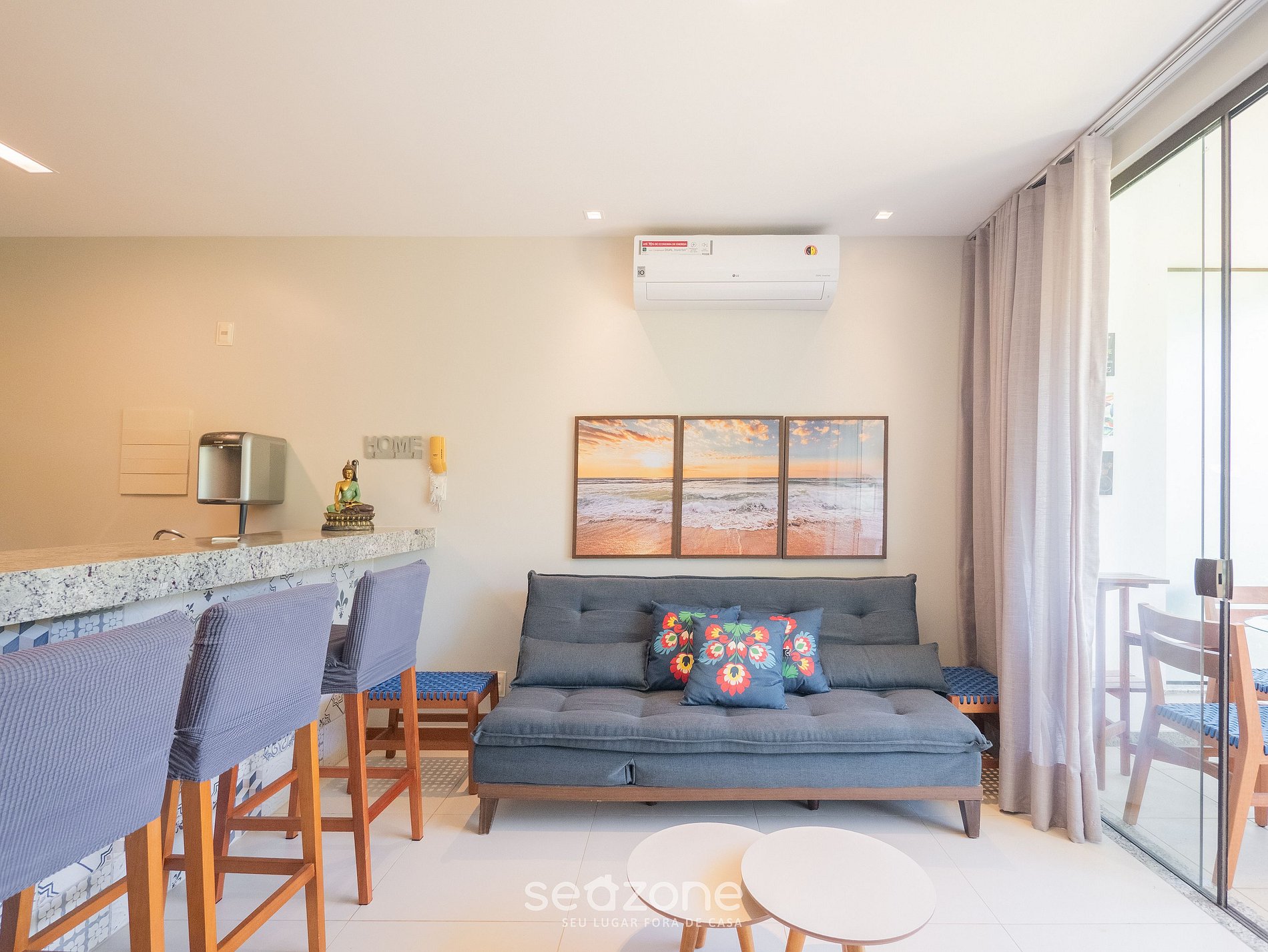 - Sala de estar com sofá-cama casal, smart TV e ar-condicionado;