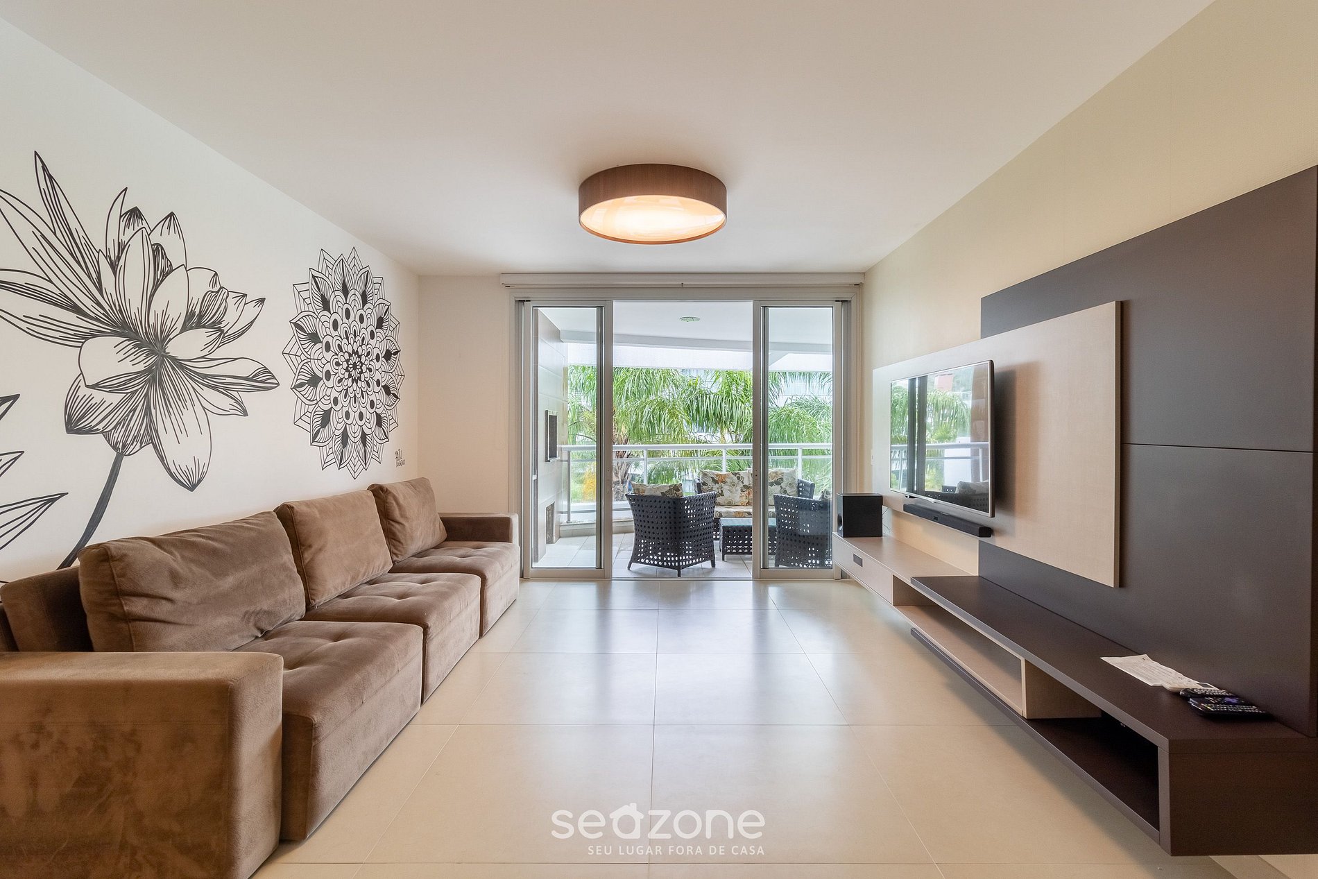 - Sala de estar com sofá, smart TV, ar-condicionado