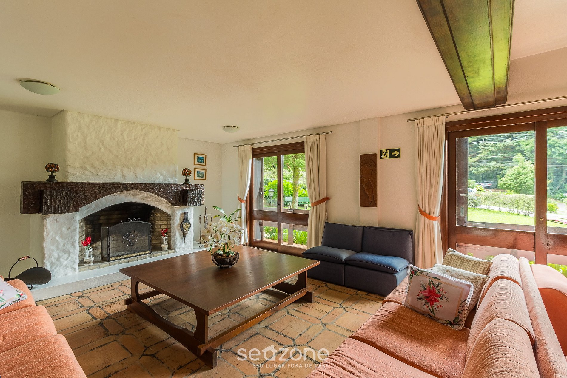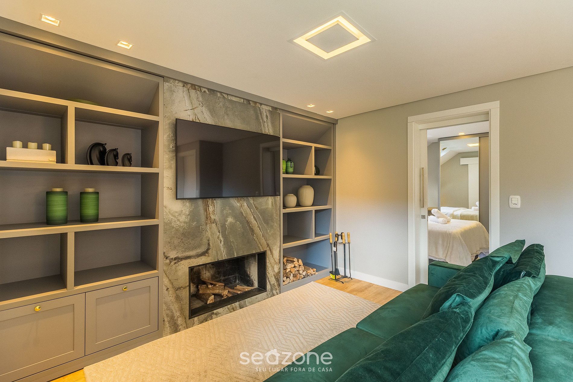 - Sala de estar com sofá-cama casal, smart TV e lareira;