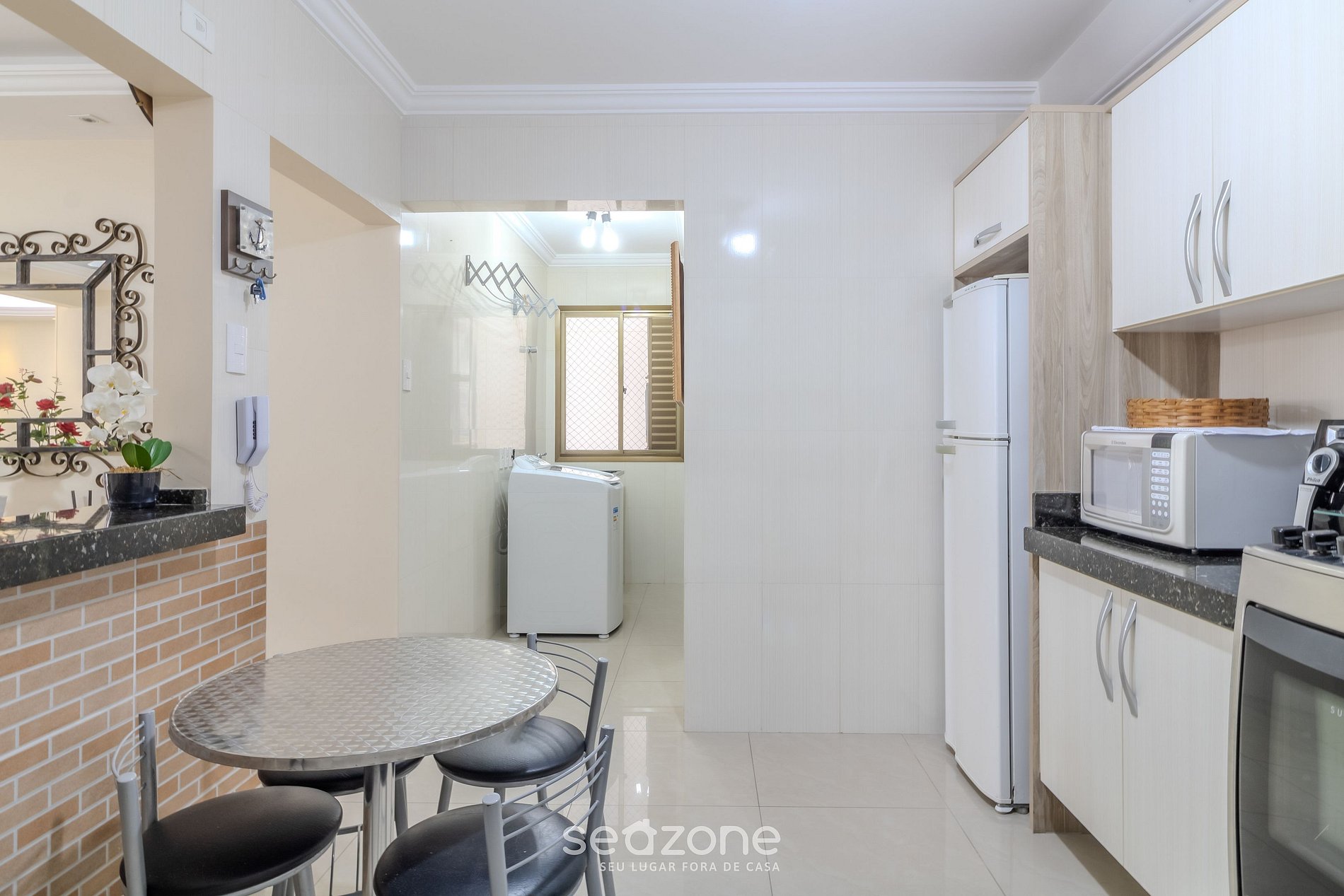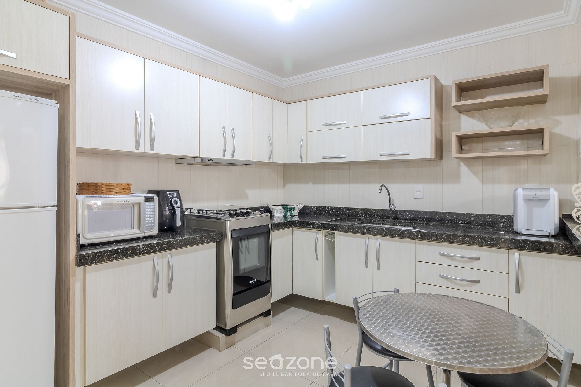 - Cozinha completa com geladeira, fogão, forno, airfryer, micro-ondas, cafeteira elétrica, filtro de água, chaleira, sanduicheira, liquidificador, taças de vinho, panelas, louças e utensílios;