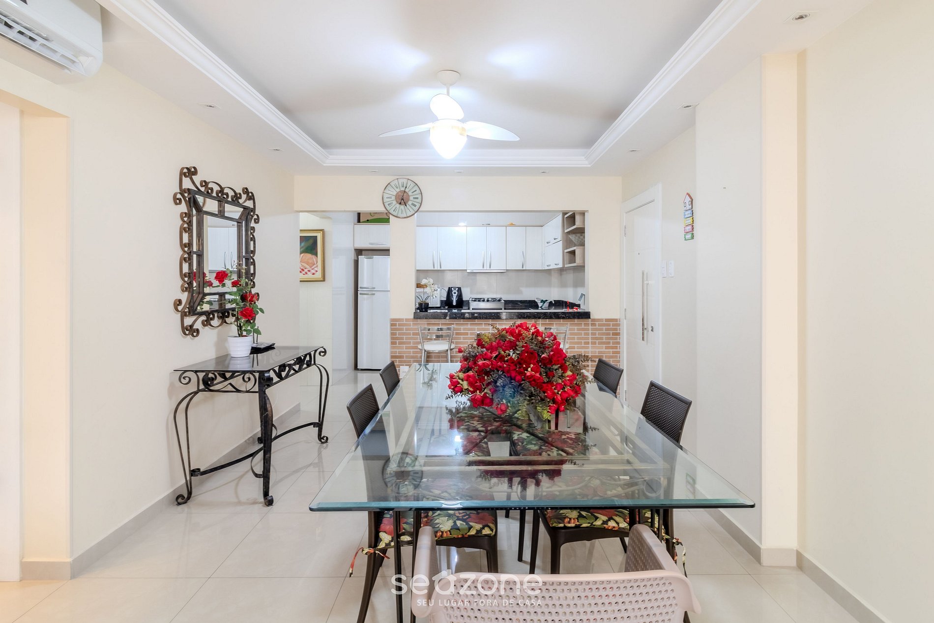 - Sala de estar com sofá, TV smart, ventilador de teto e ar-condicionado;