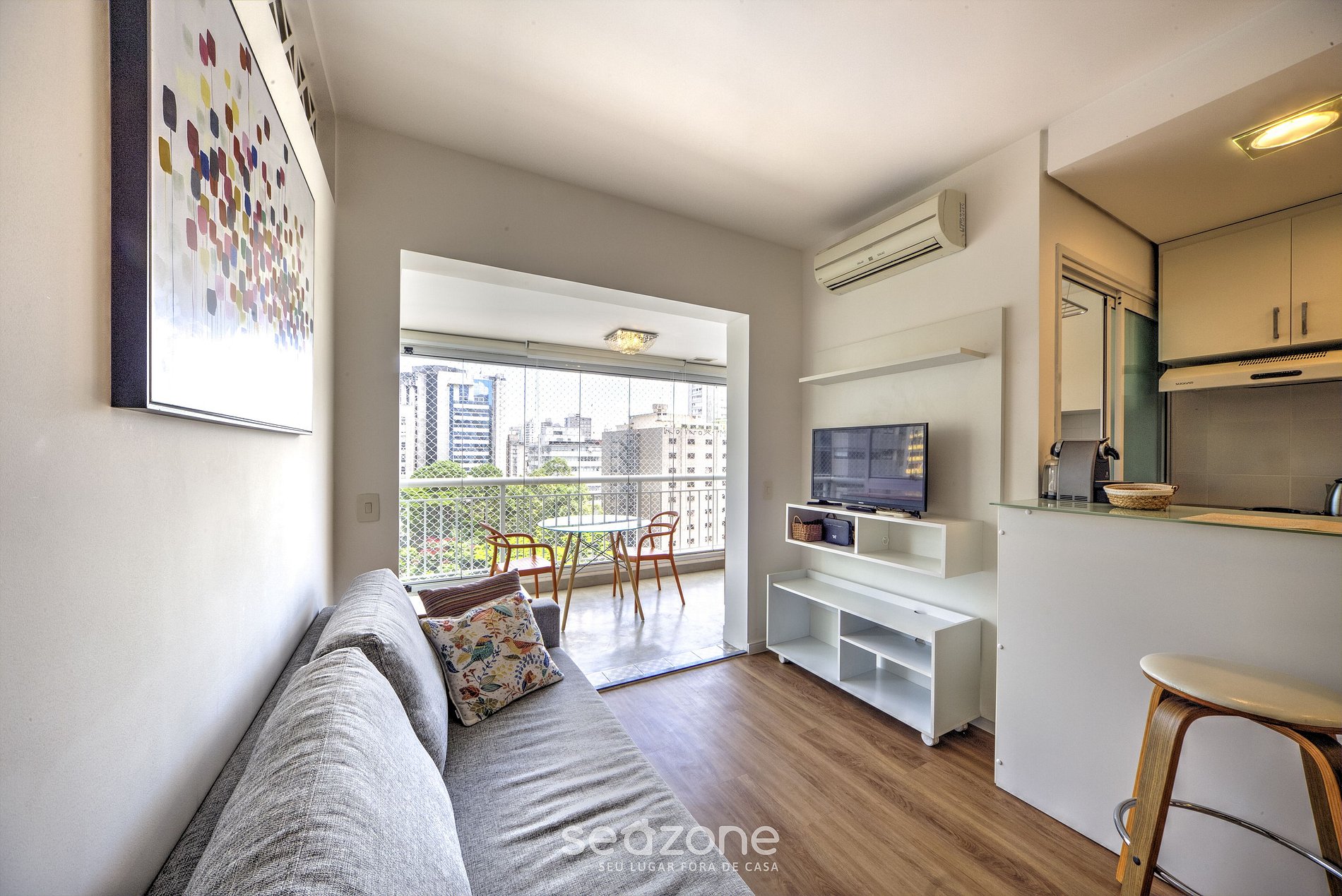 - Sala de estar com sofá, Smart Tv e ar-condicionado;