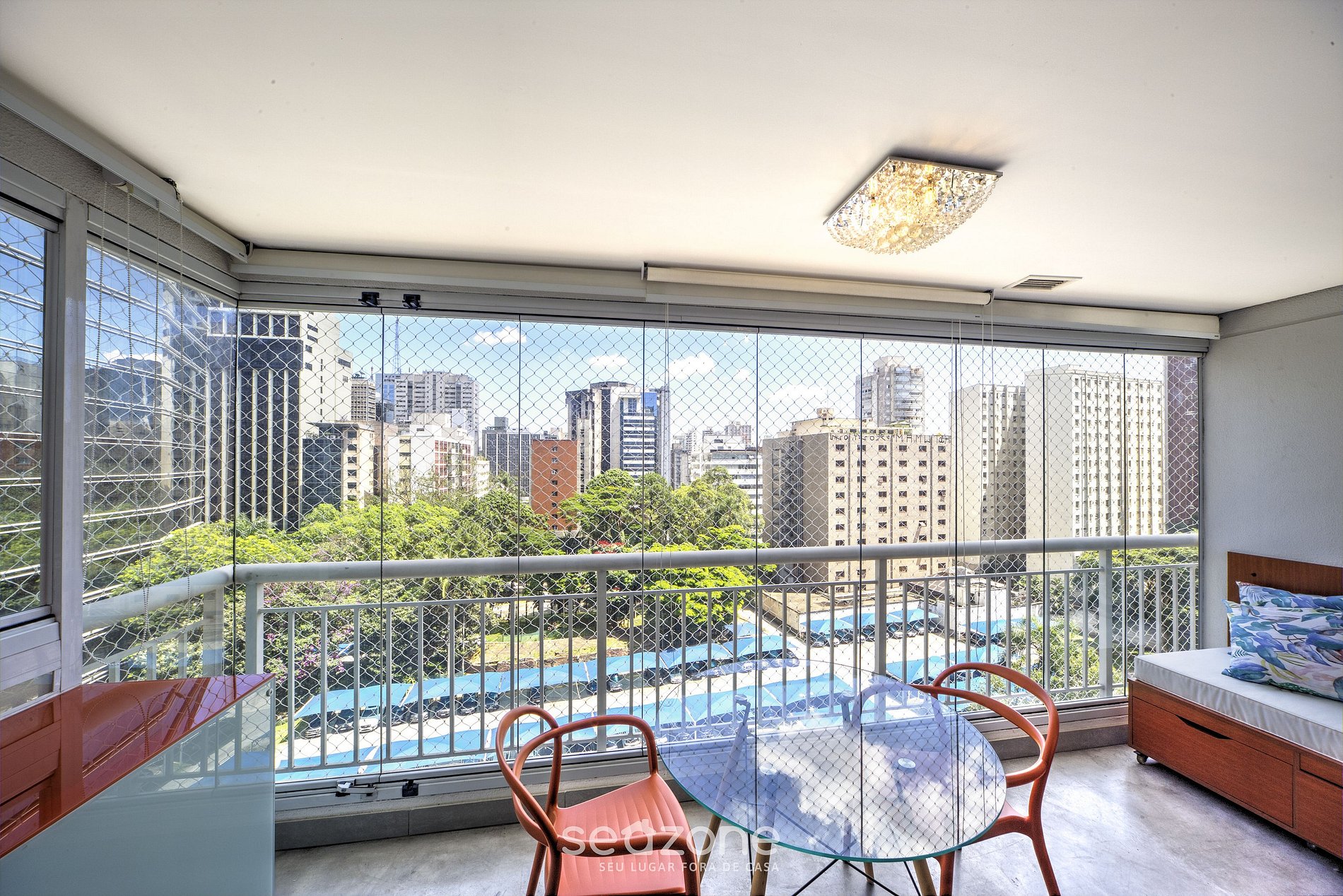 - Ampla varanda com móveis externos e vista para a cidade;