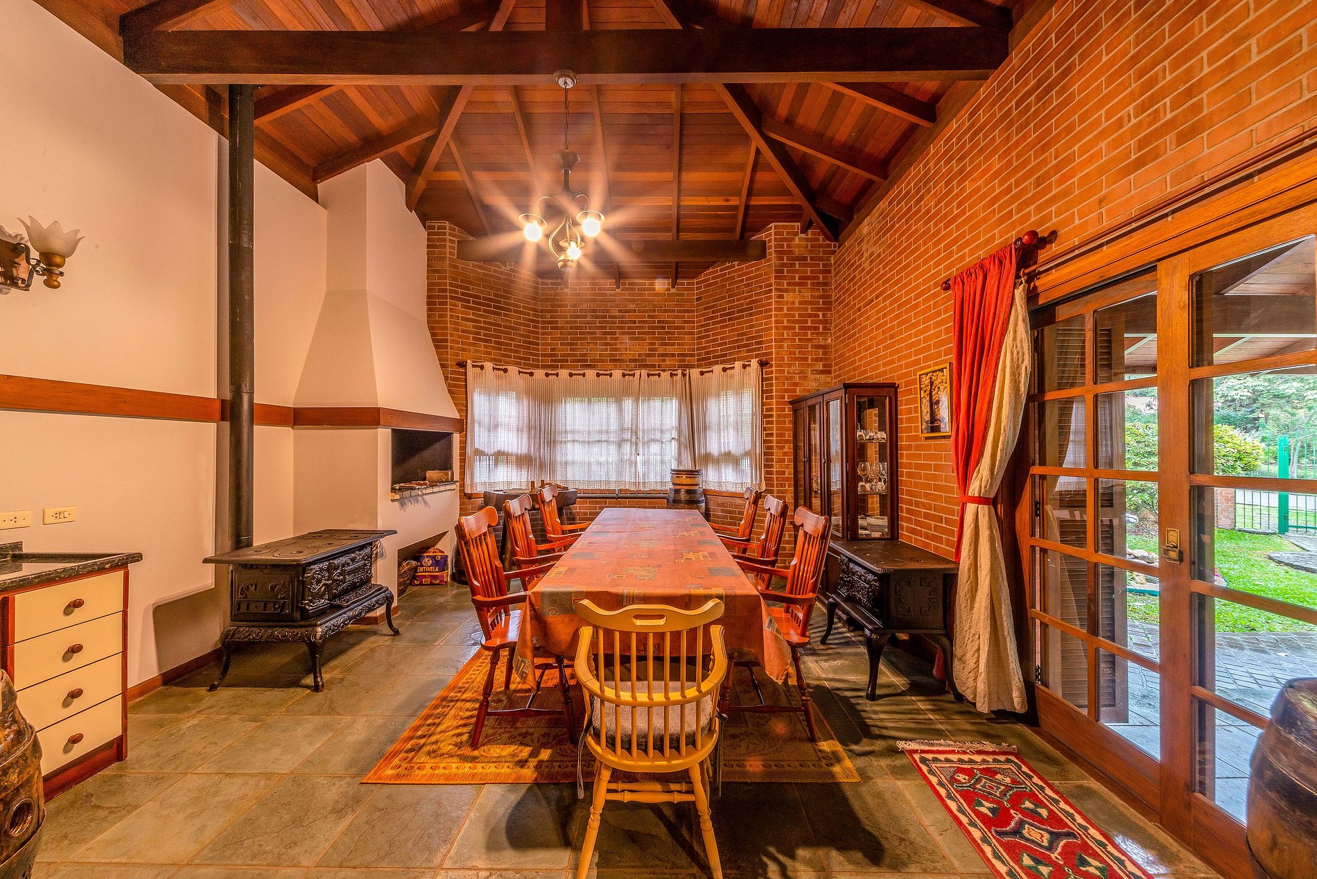 - Sala de jantar com mesa para refeições com 8 assentos, pia, fogão à lenha, churrasqueira convencional e cristaleira;
