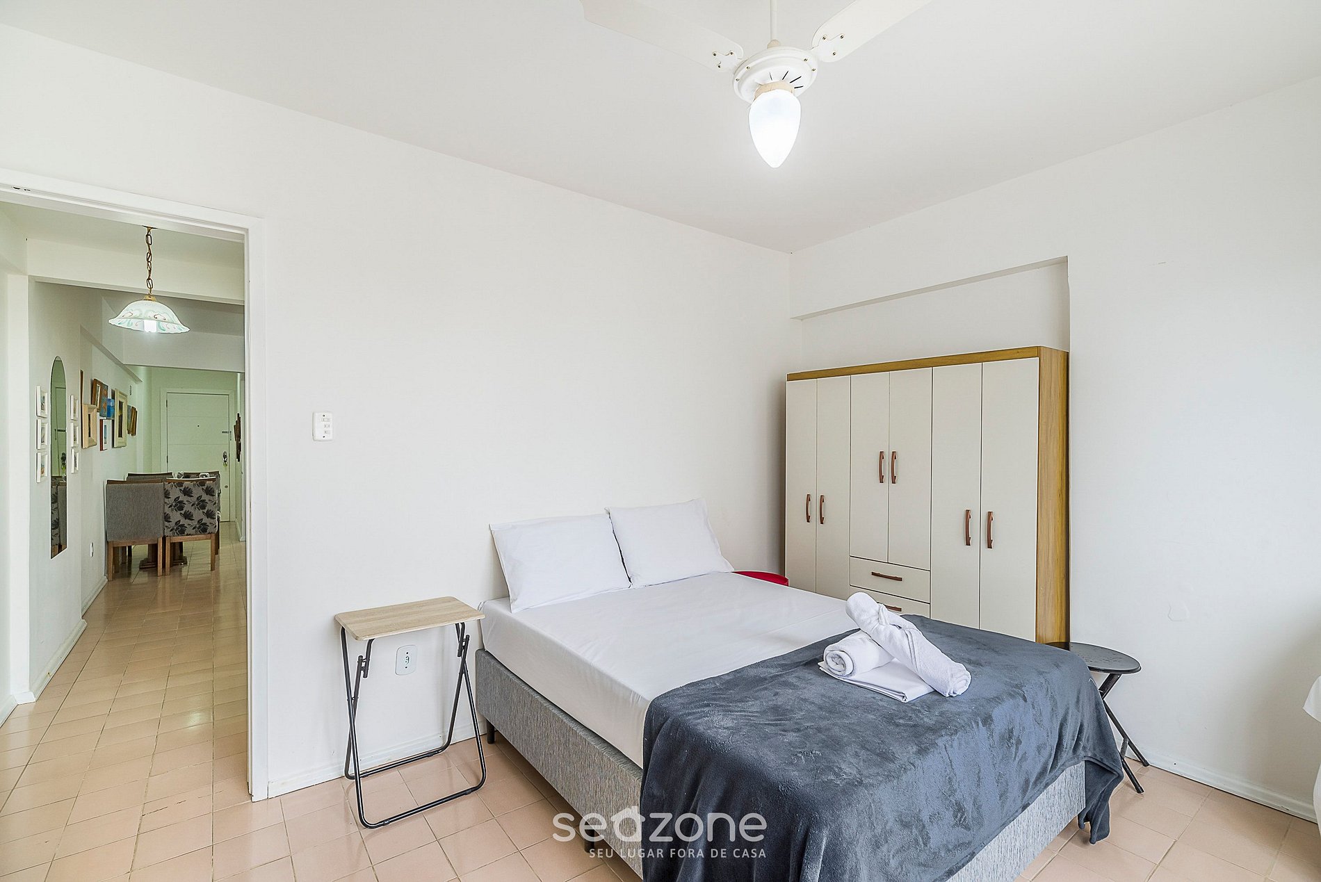 - 1 Quarto com cama queen, ar-condicionado, ventilador de teto e um guarda-roupa.