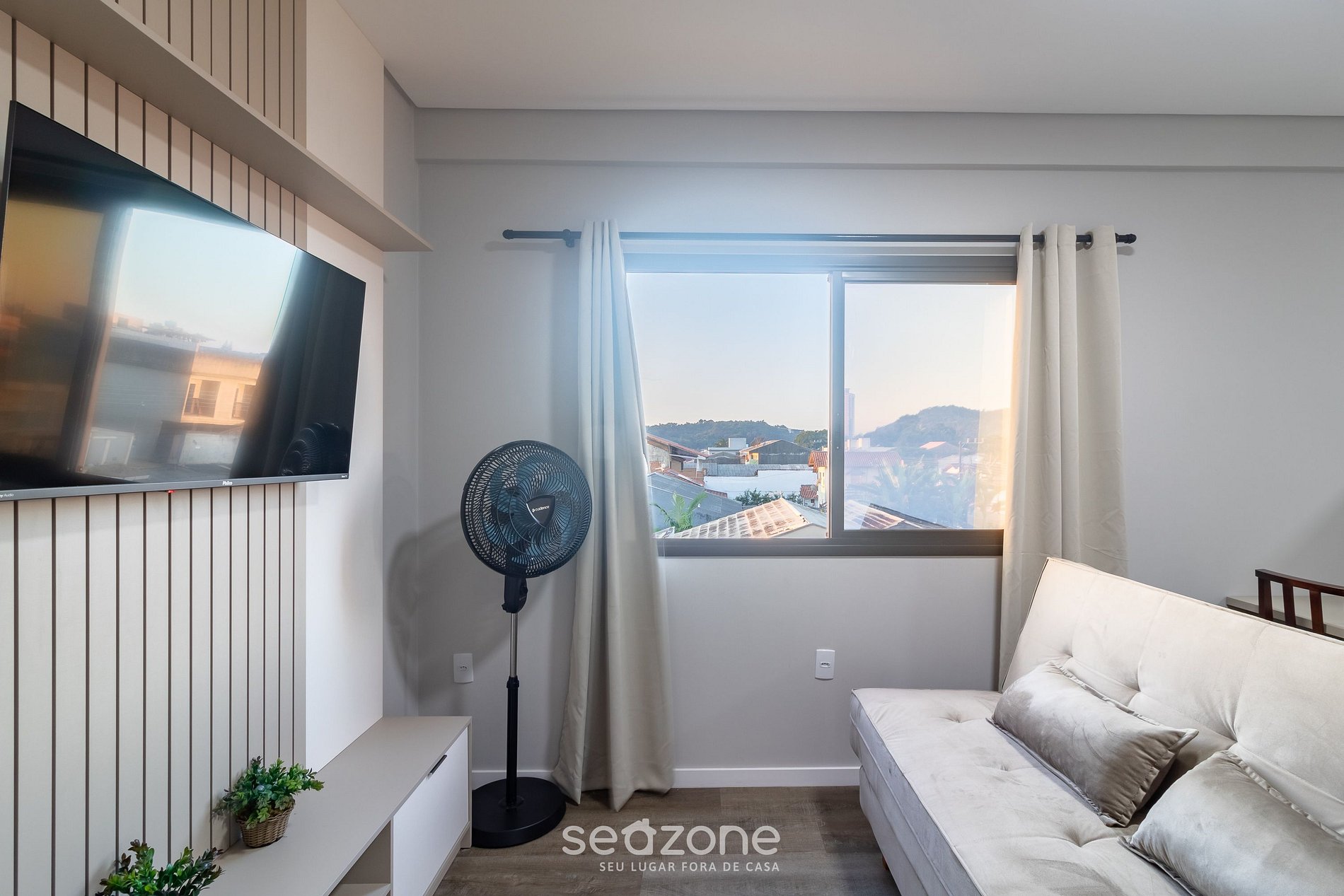 - Sala de estar com sofá-cama, Smart TV e ventilador portátil;