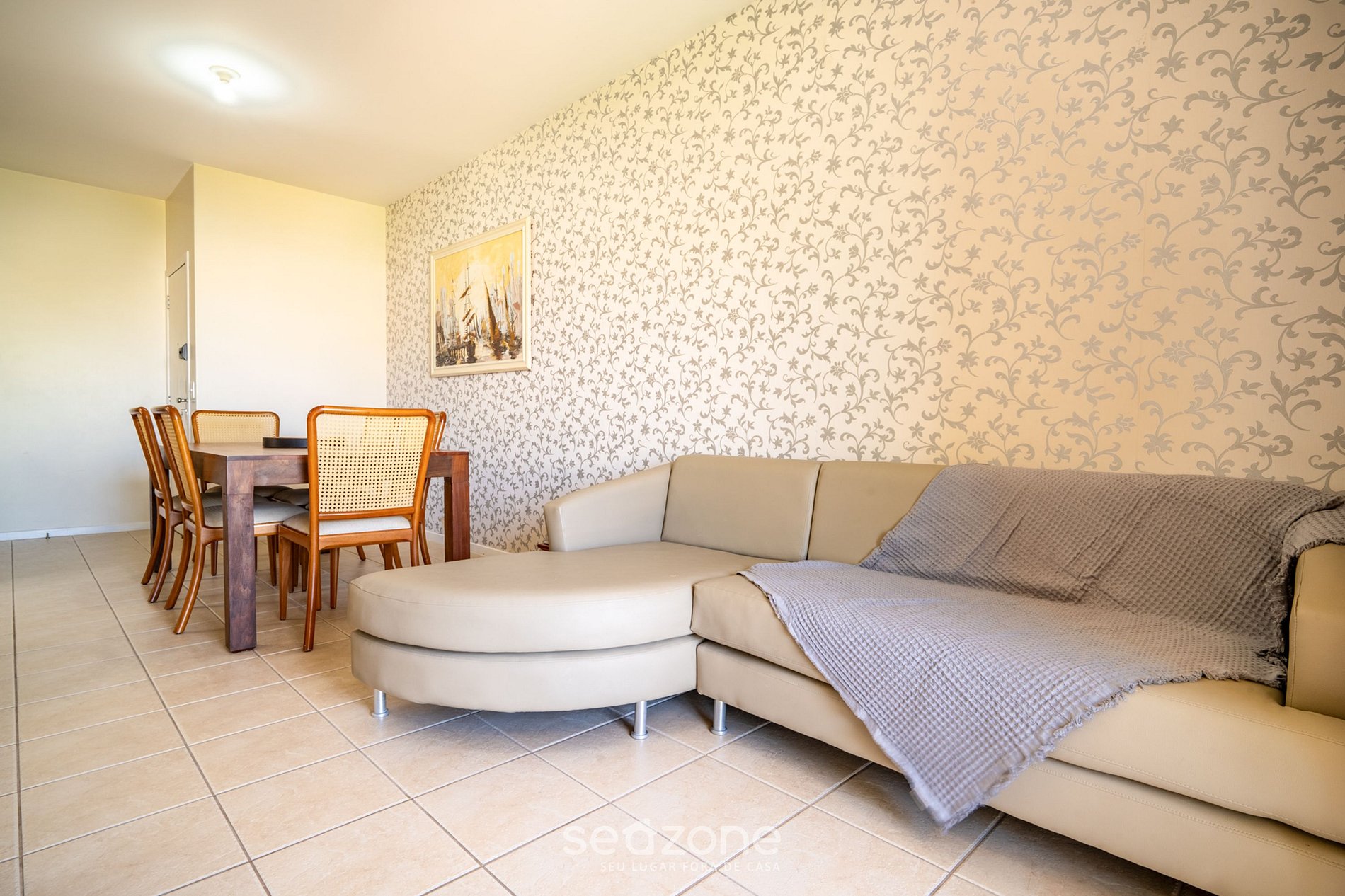 - Sala de estar com sofá, Smart TV, ventilador de teto e portátil;