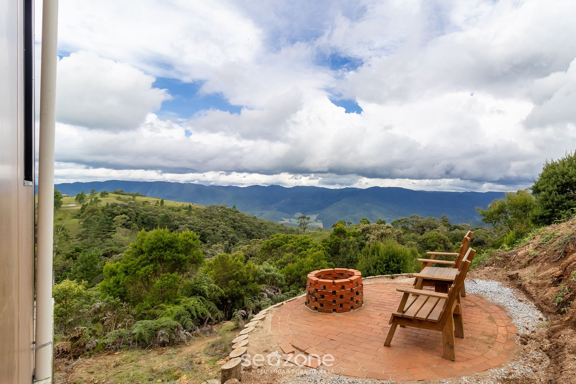 - Ampla varanda com vista para a montanha, lareira e cadeiras.