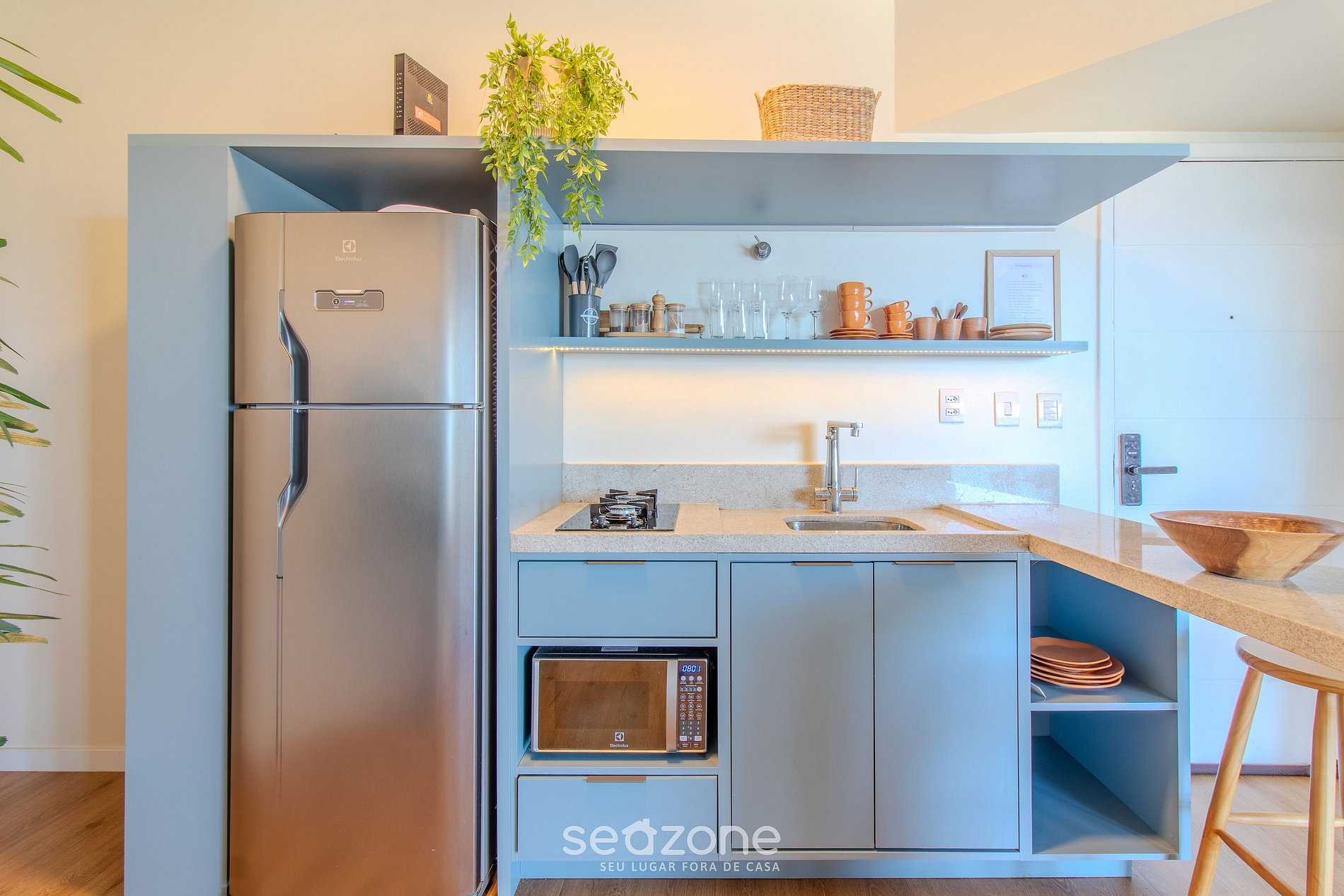 - Cozinha completa com geladeira, fogão cooktop, micro-ondas, liquidificador, sanduicheira, Kit café (garrafa térmica, filtro/coador), chaleira, taças de vinho, panelas, louças e utensílios;