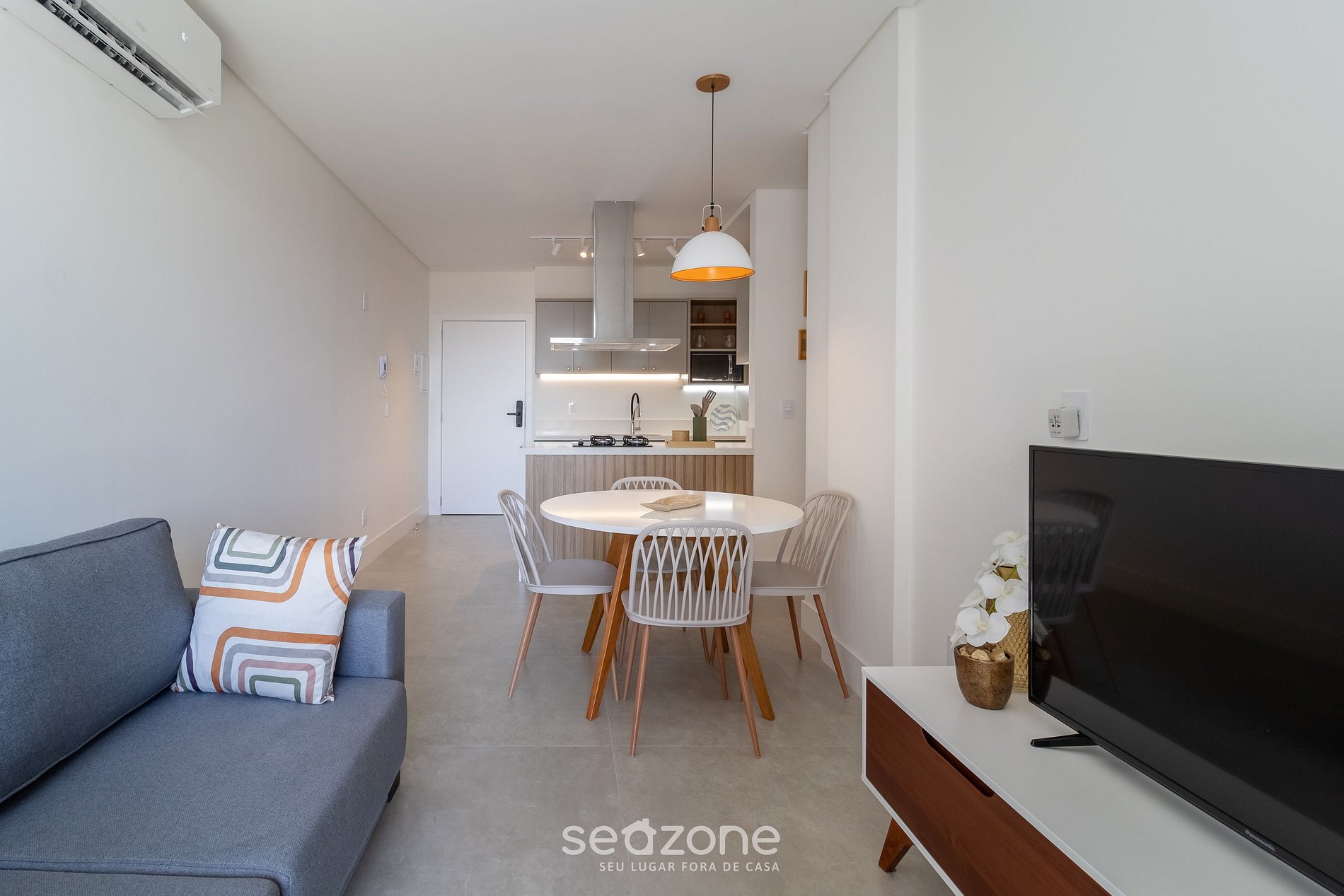 - Sala de estar com sofá-cama, Smart TV e ar-condicionado.