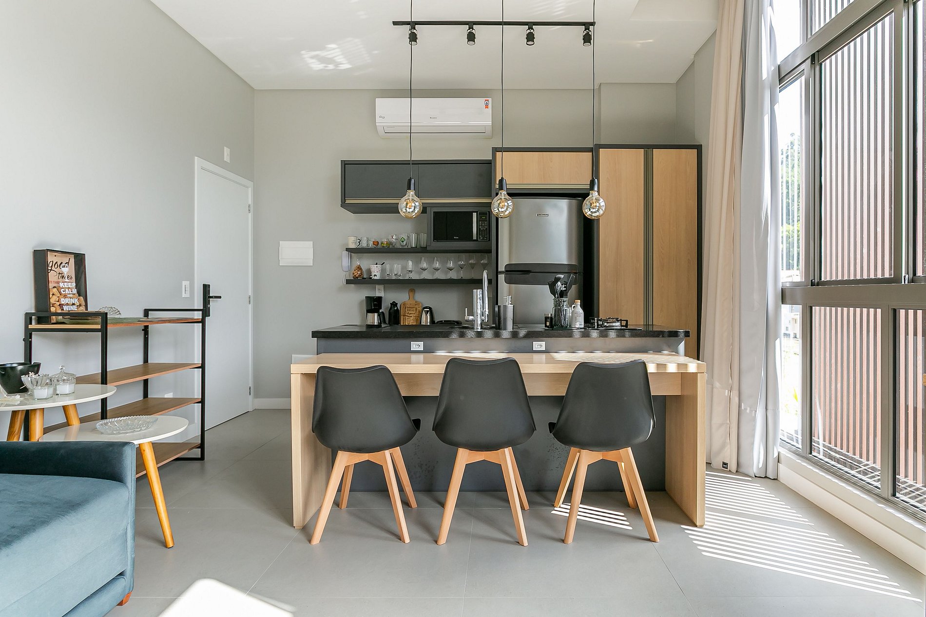 - Cozinha compacta com geladeira, fogão cooktop, micro-ondas, sanduicheira, cafeteira, chaleira elétrica, liquidificador, panelas, louças e utensílios;