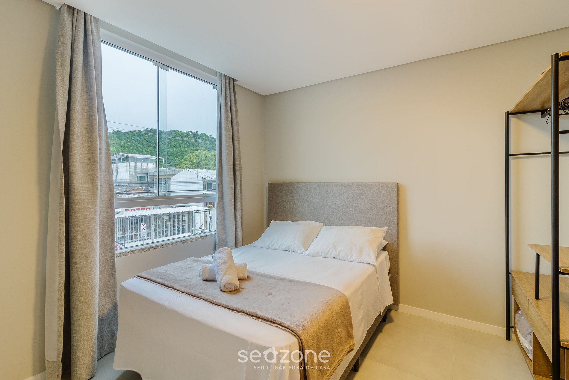 - Cama de casal, arara para roupas, smart TV, sofá, cortinas blackout e ar-condicionado;