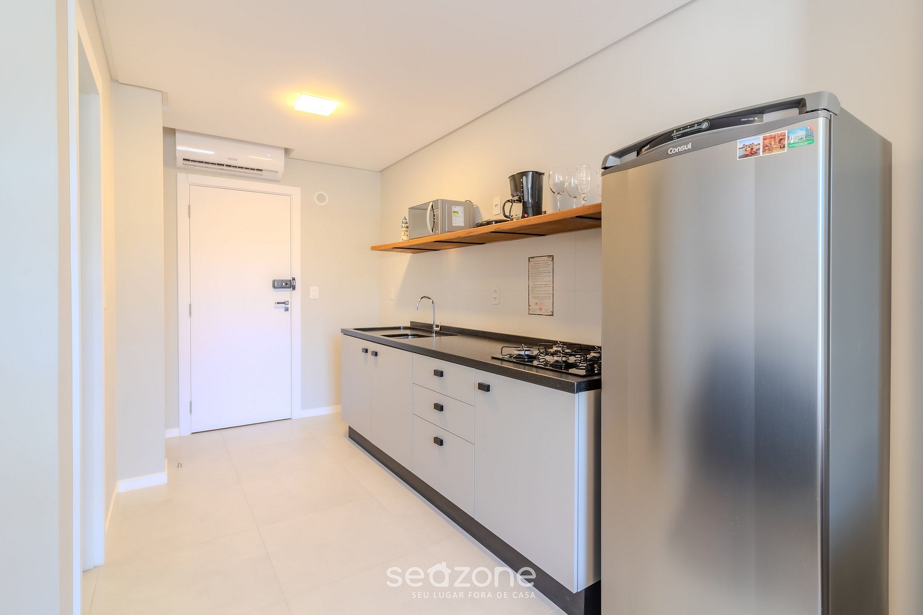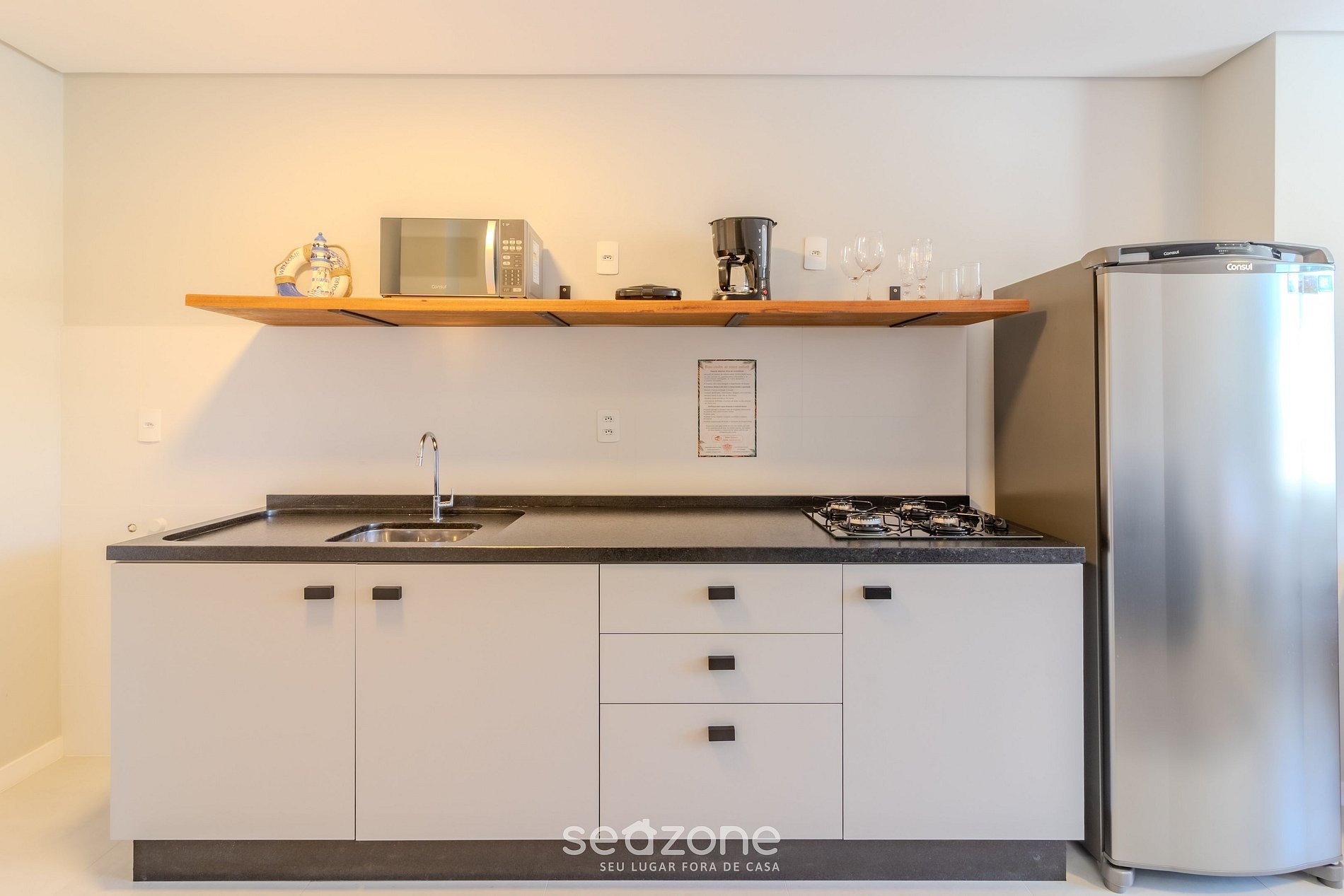 - Cozinha completa com geladeira, fogão cooktop, micro-ondas, sanduicheira, cafeteira elétrica, chaleira, taças de vinho, panelas, louças e utensílios;