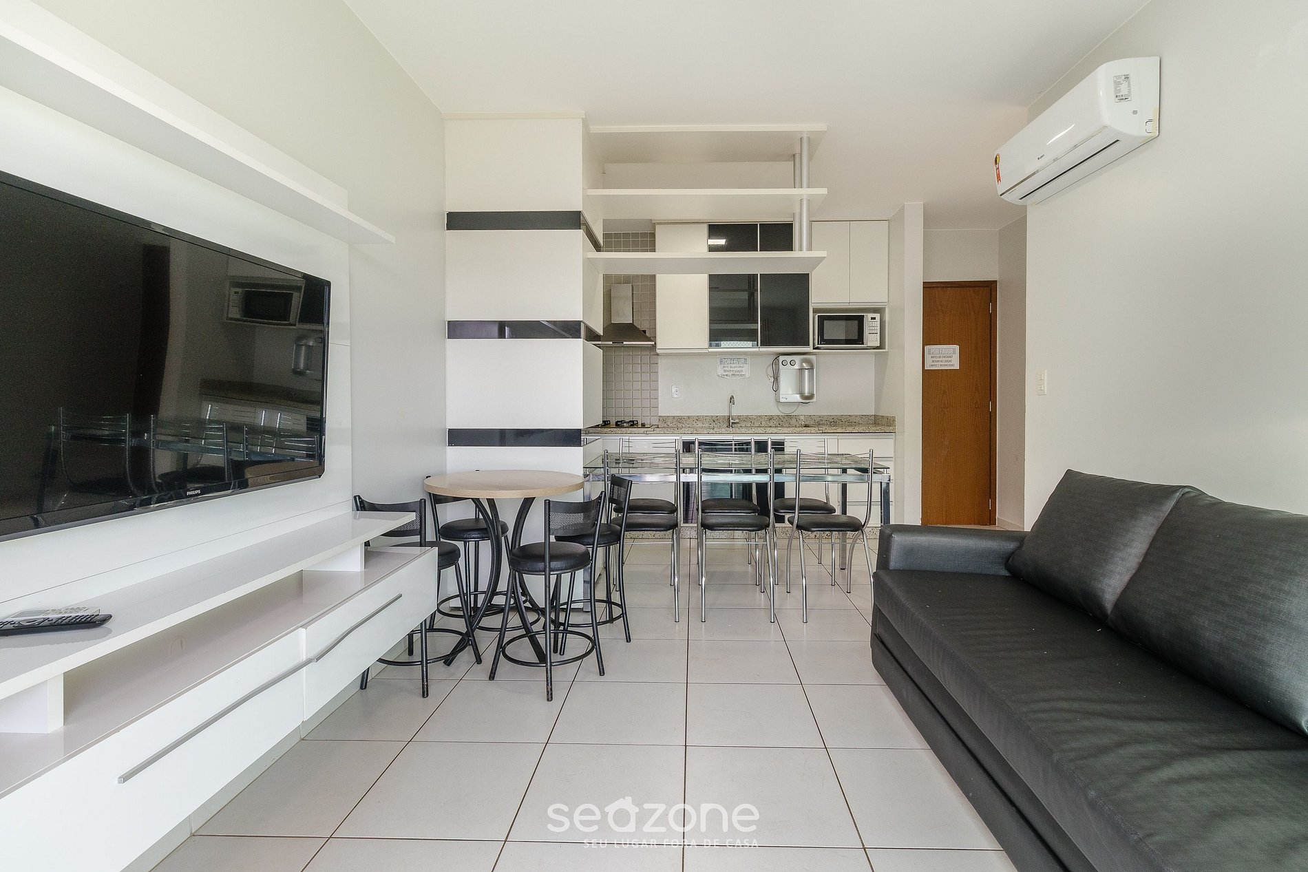 - Sala de estar com sofá, Smart TV e ar-condicionado;