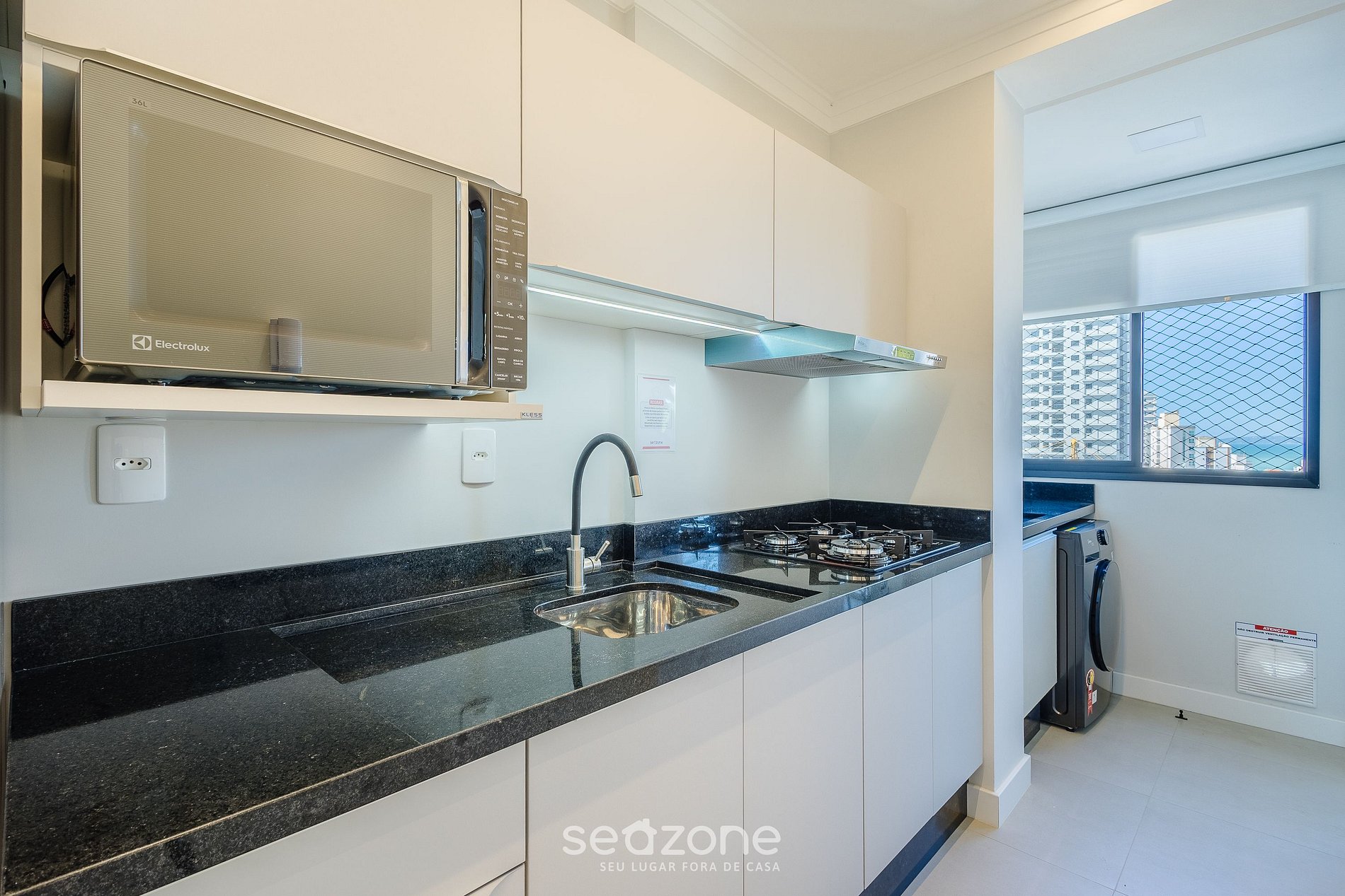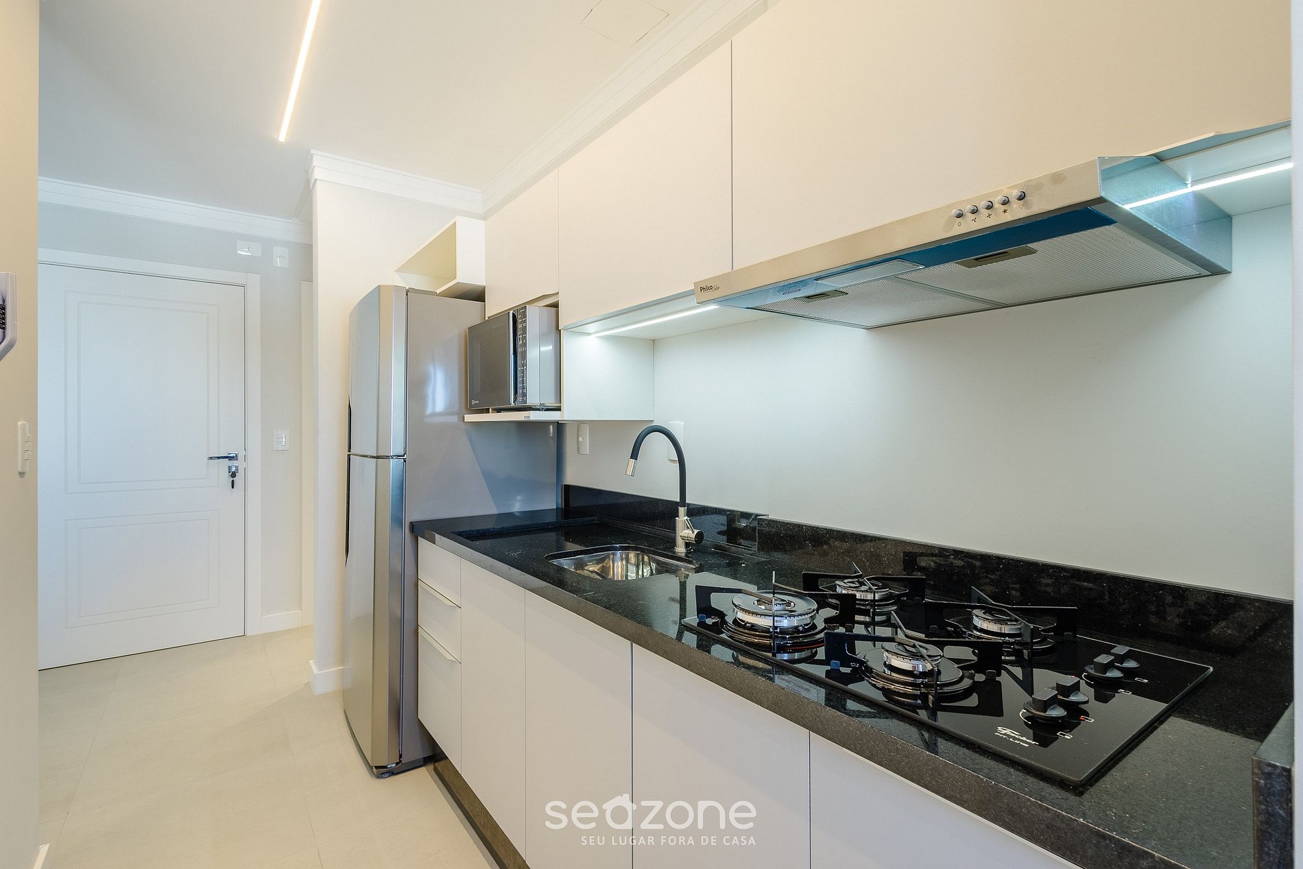 - Cozinha completa com geladeira, fogão cooktop (gás), micro-ondas, cafeteira elétrica, chaleira elétrica, sanduicheira, liquidificador, taças de vinho, panelas, louças e utensílios;