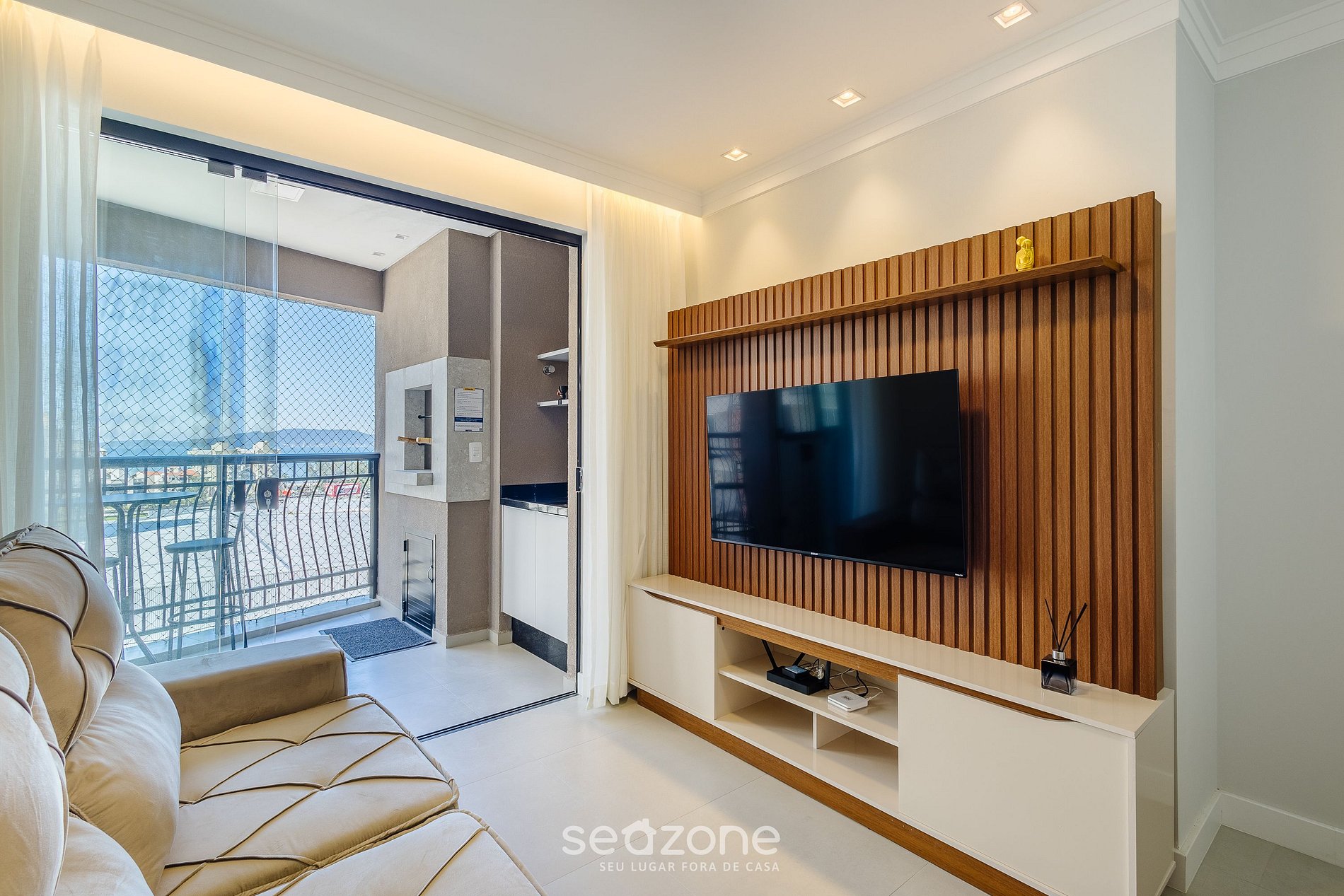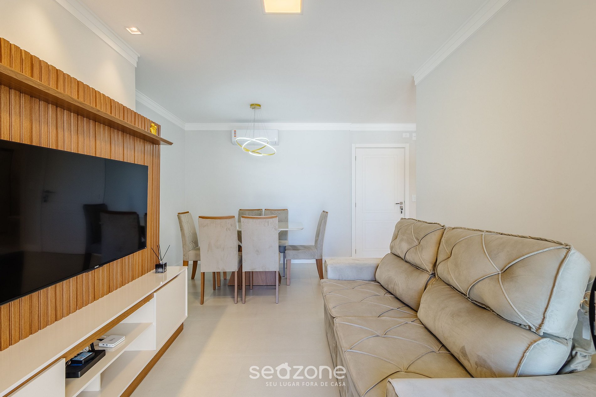 - Sala de estar com sofá, Smart TV e ar-condicionado;