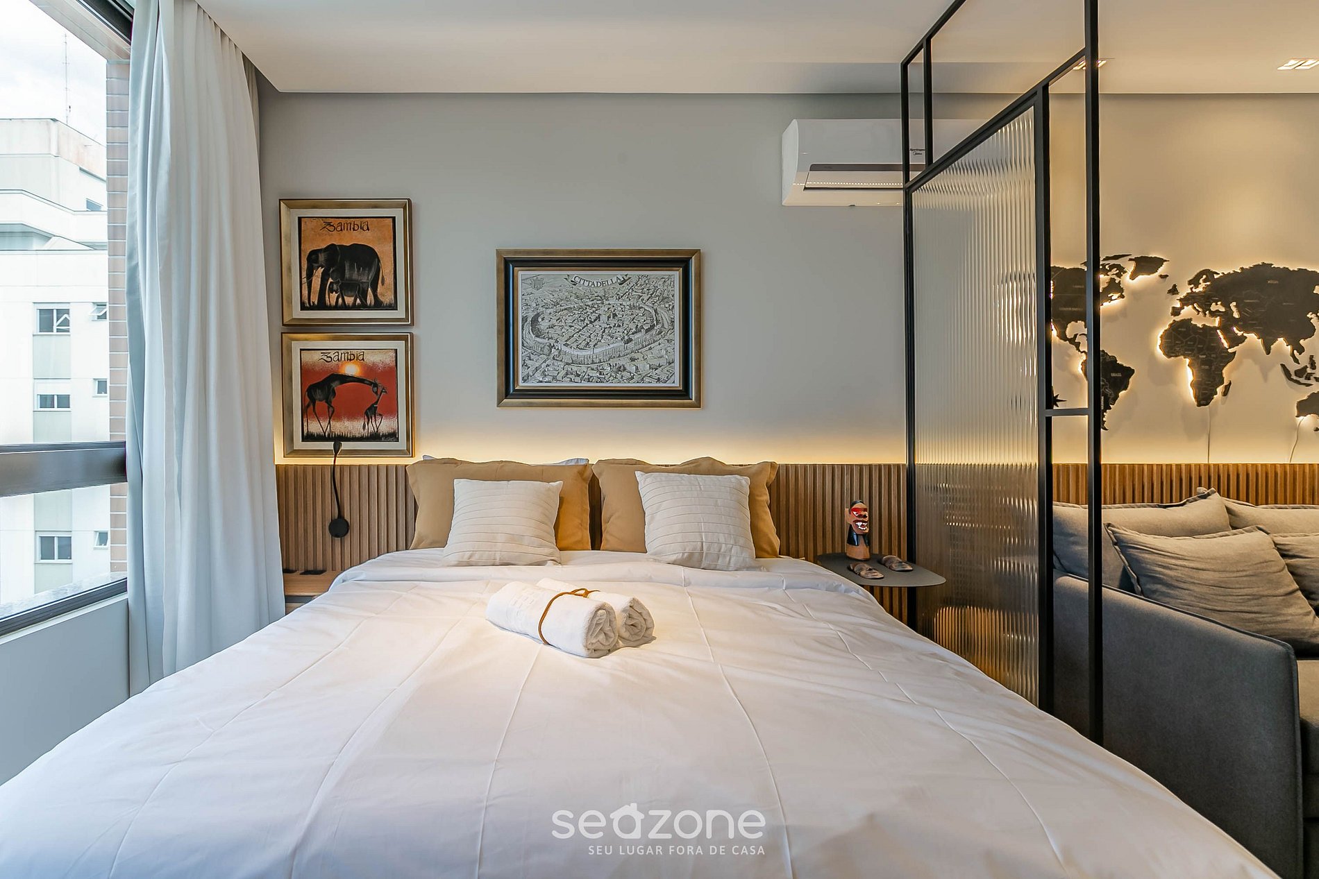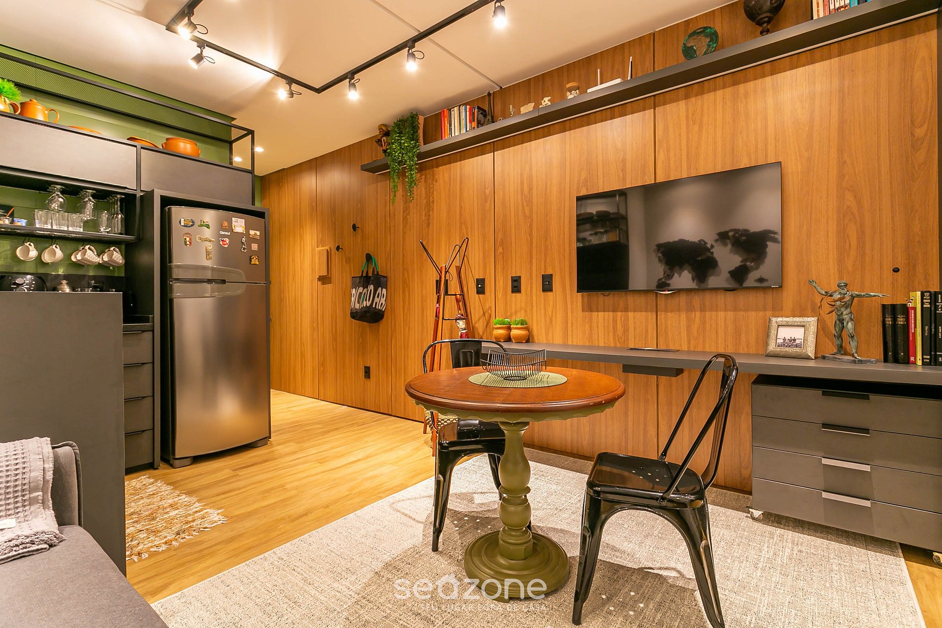 - Studio com decoração nova e moderna com móveis planejados e ambientes integrados;