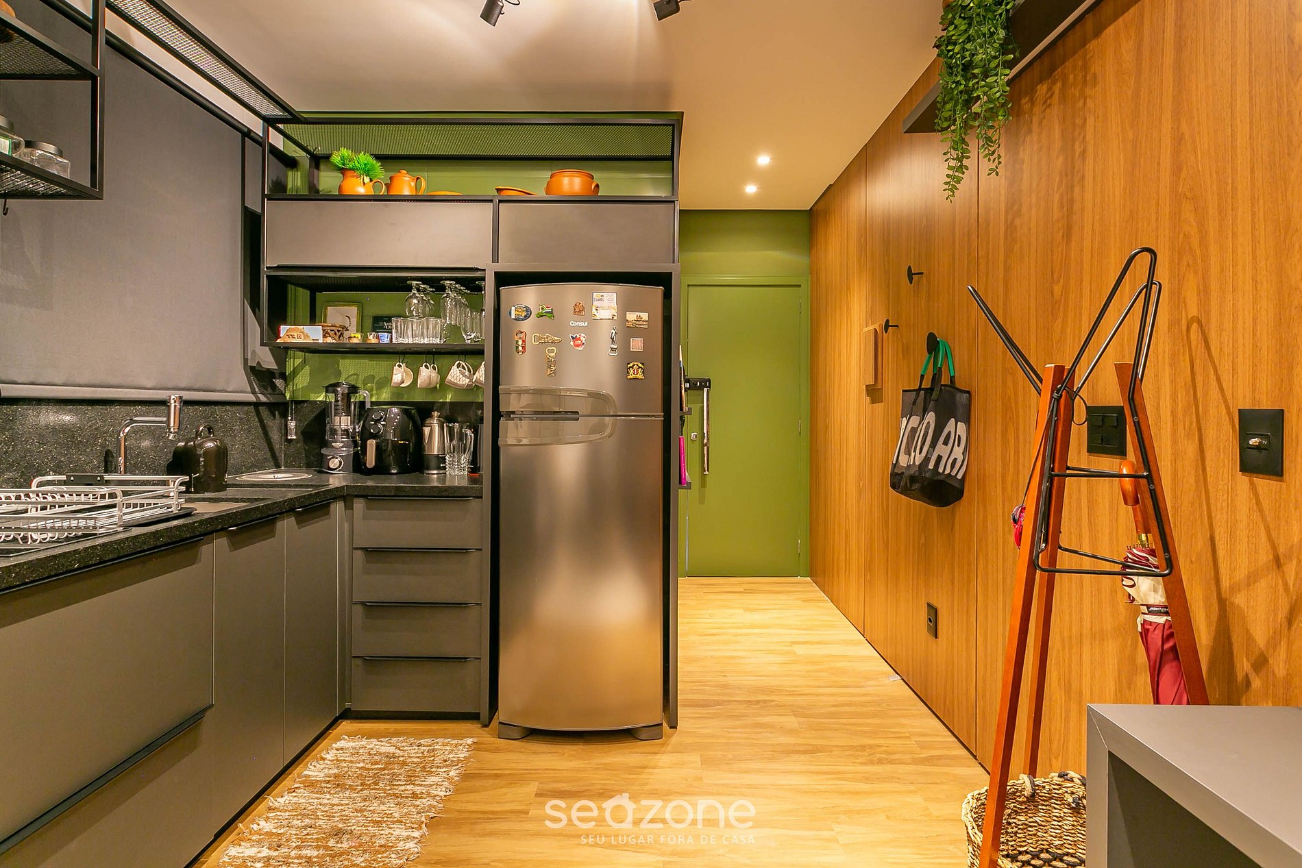 - Cozinha compacta com geladeira, fogão, forno, chaleira elétrica, cafeteira, panelas e outros utensílios;