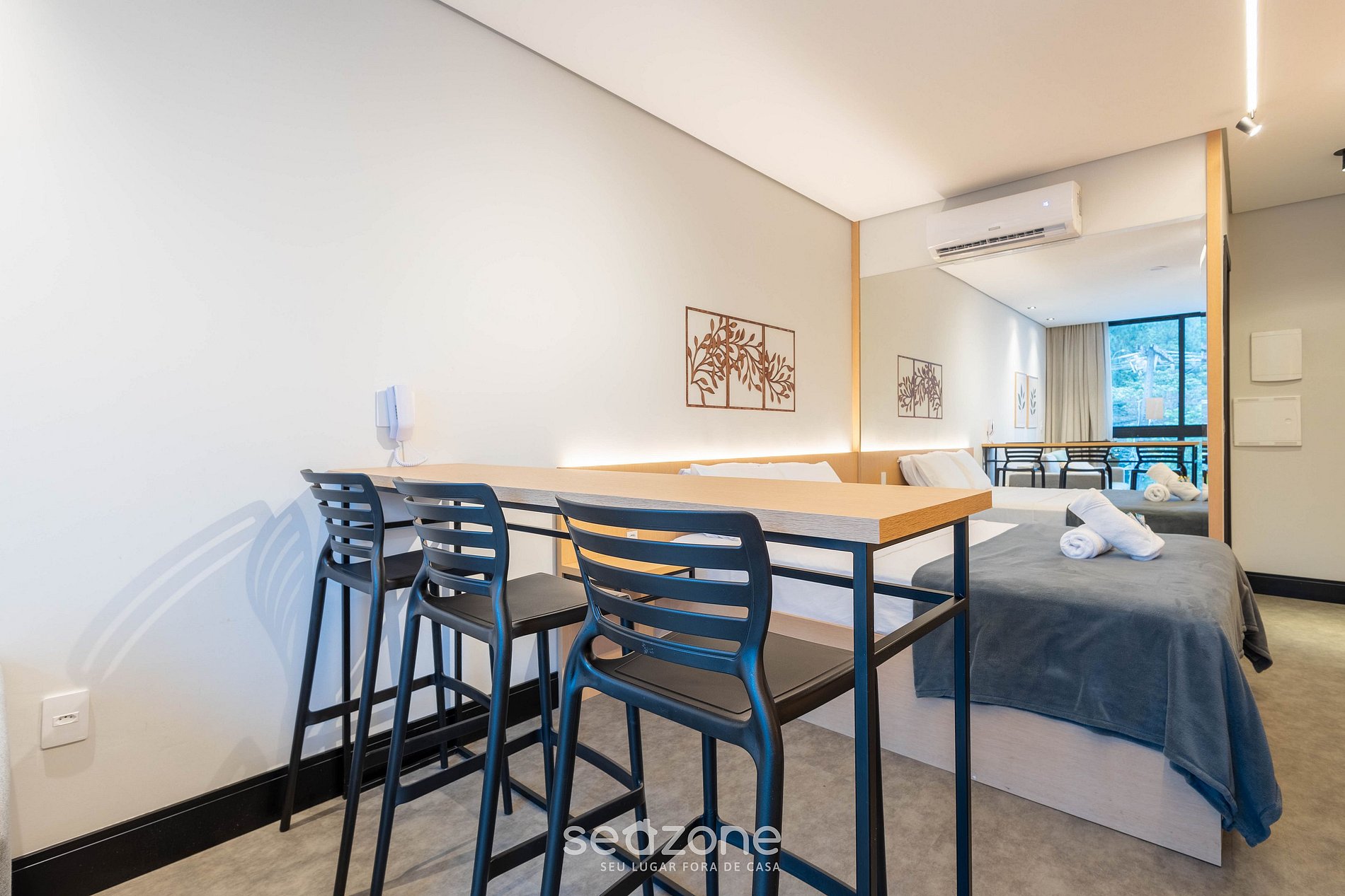 Equilibre conforto e inovação neste studio a poucos minutos da Praia Brava. Energia renovável e automação inteligente se encontram para garantir uma experiência sem igual. A cama queen e o sofá-cama acomodam com aconchego, a sacada abre para a natureza, enquanto o acesso facial protege seu sossego. Viva a harmonia entre tecnologia e meio ambiente.