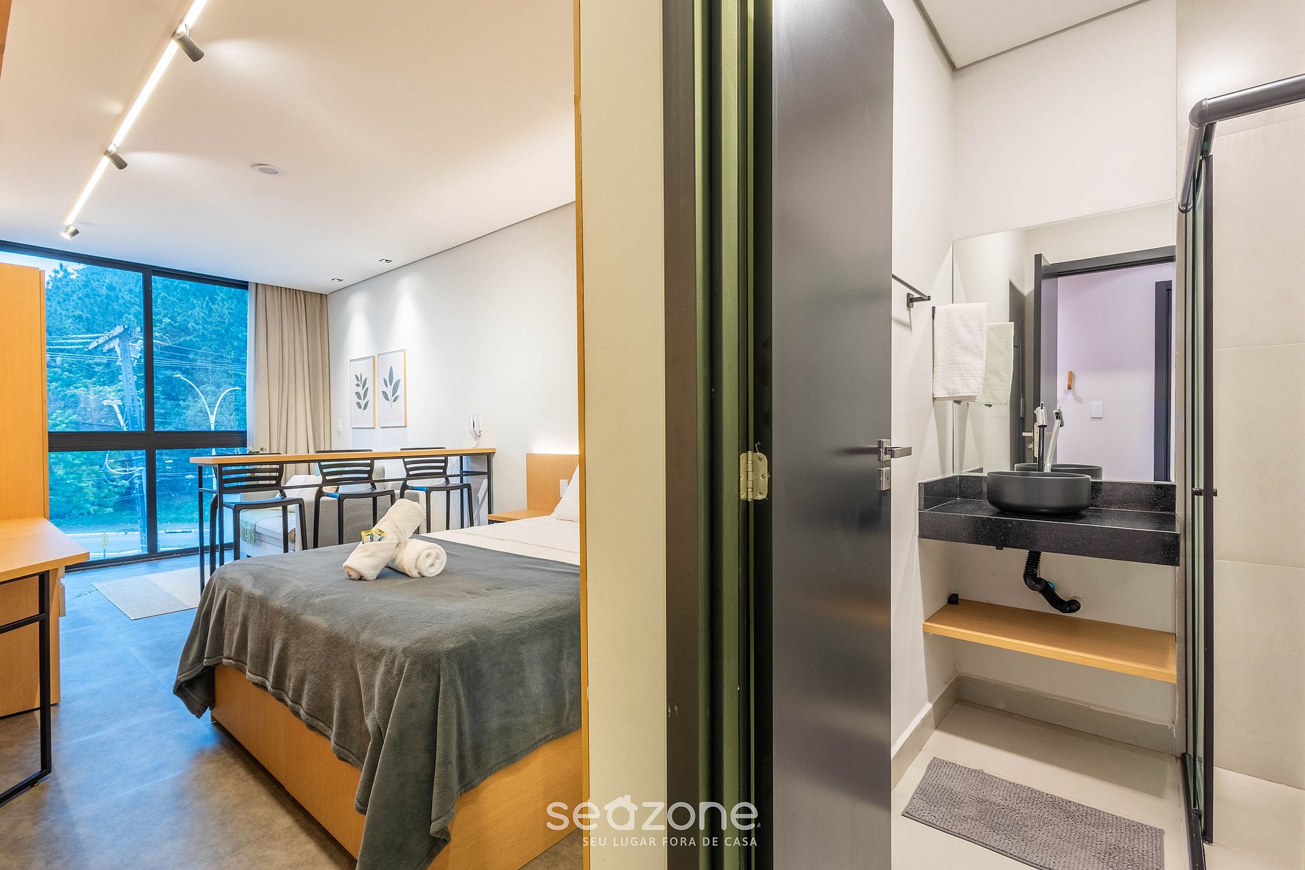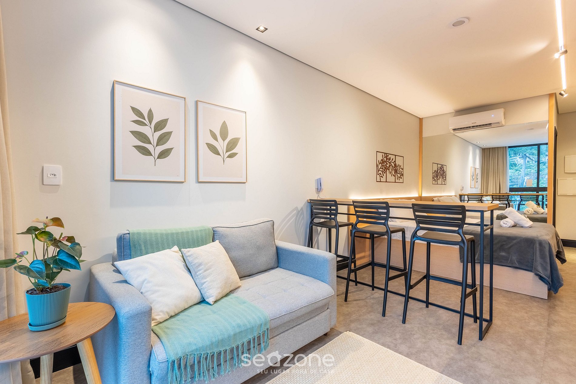 Equilibre conforto e inovação neste studio a poucos minutos da Praia Brava. Energia renovável e automação inteligente se encontram para garantir uma experiência sem igual. A cama queen e o sofá-cama acomodam com aconchego, a sacada abre para a natureza, enquanto o acesso facial protege seu sossego. Viva a harmonia entre tecnologia e meio ambiente.